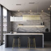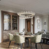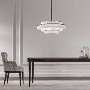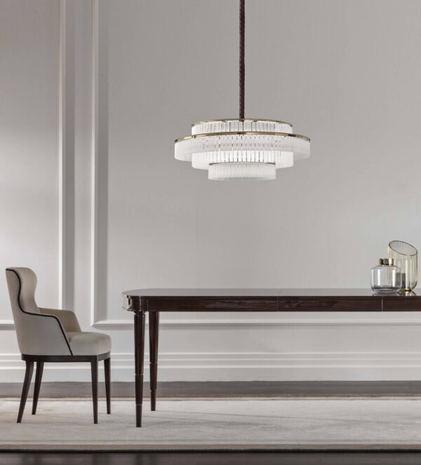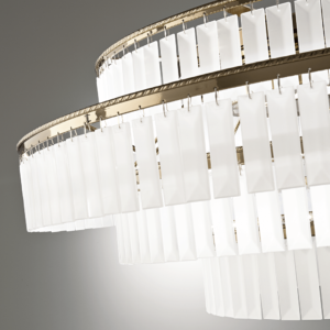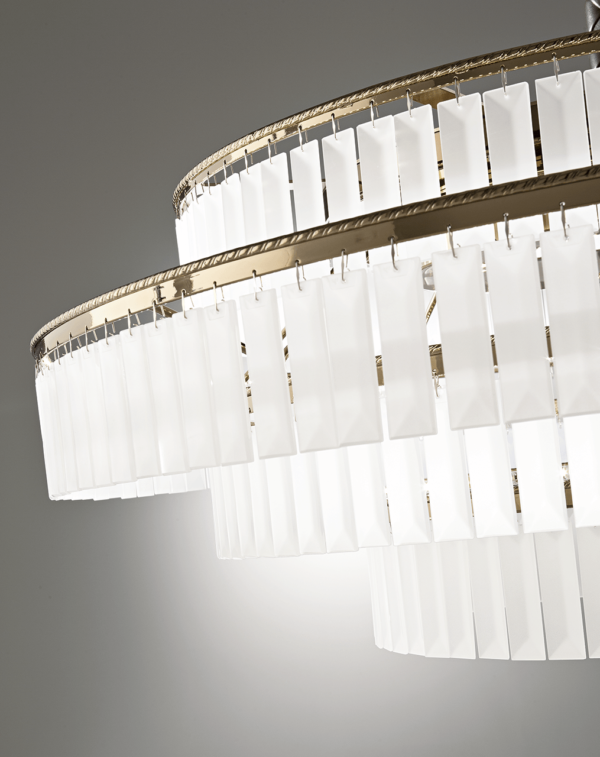 Pendant in metal with gold nickel finish and etched glass elements and leather details.
