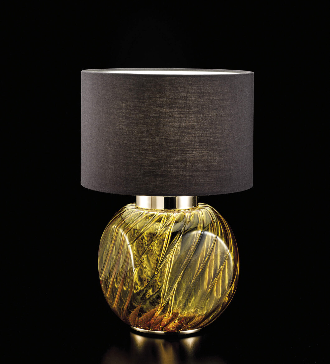 Table lamp in ruled blown glass with light gold or chrome metal finish and fabric diffuser. Available in different colours.