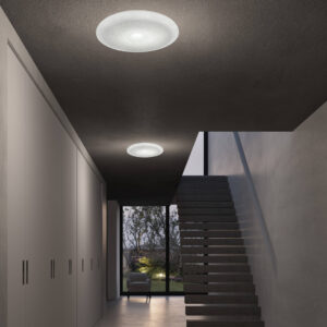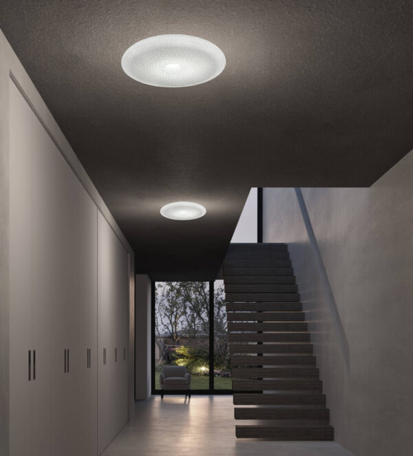 Wall or ceiling lamp made of blown art glass blown glass with poriferous surface. Structure metal with white finish.