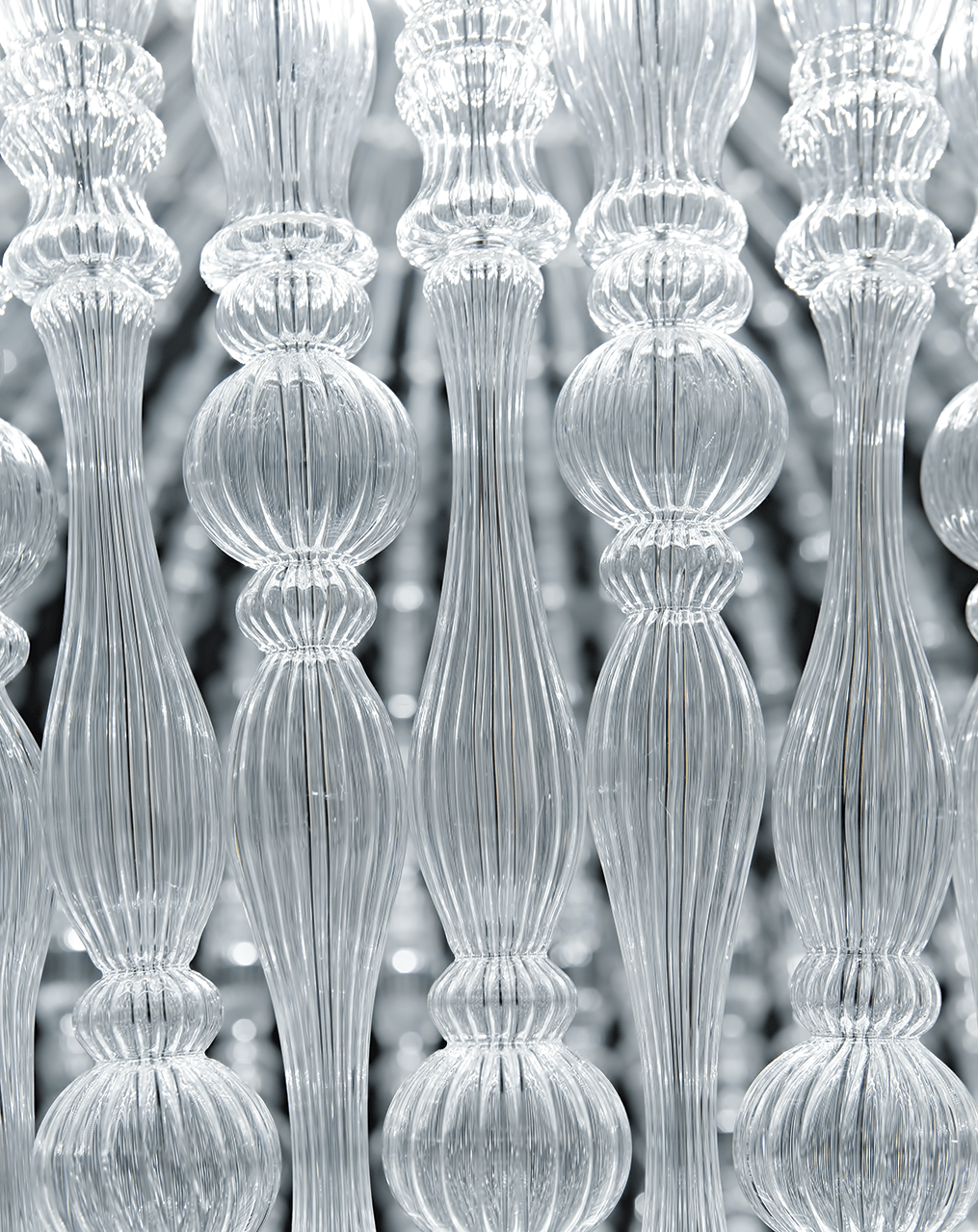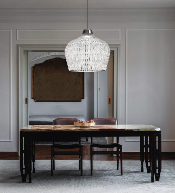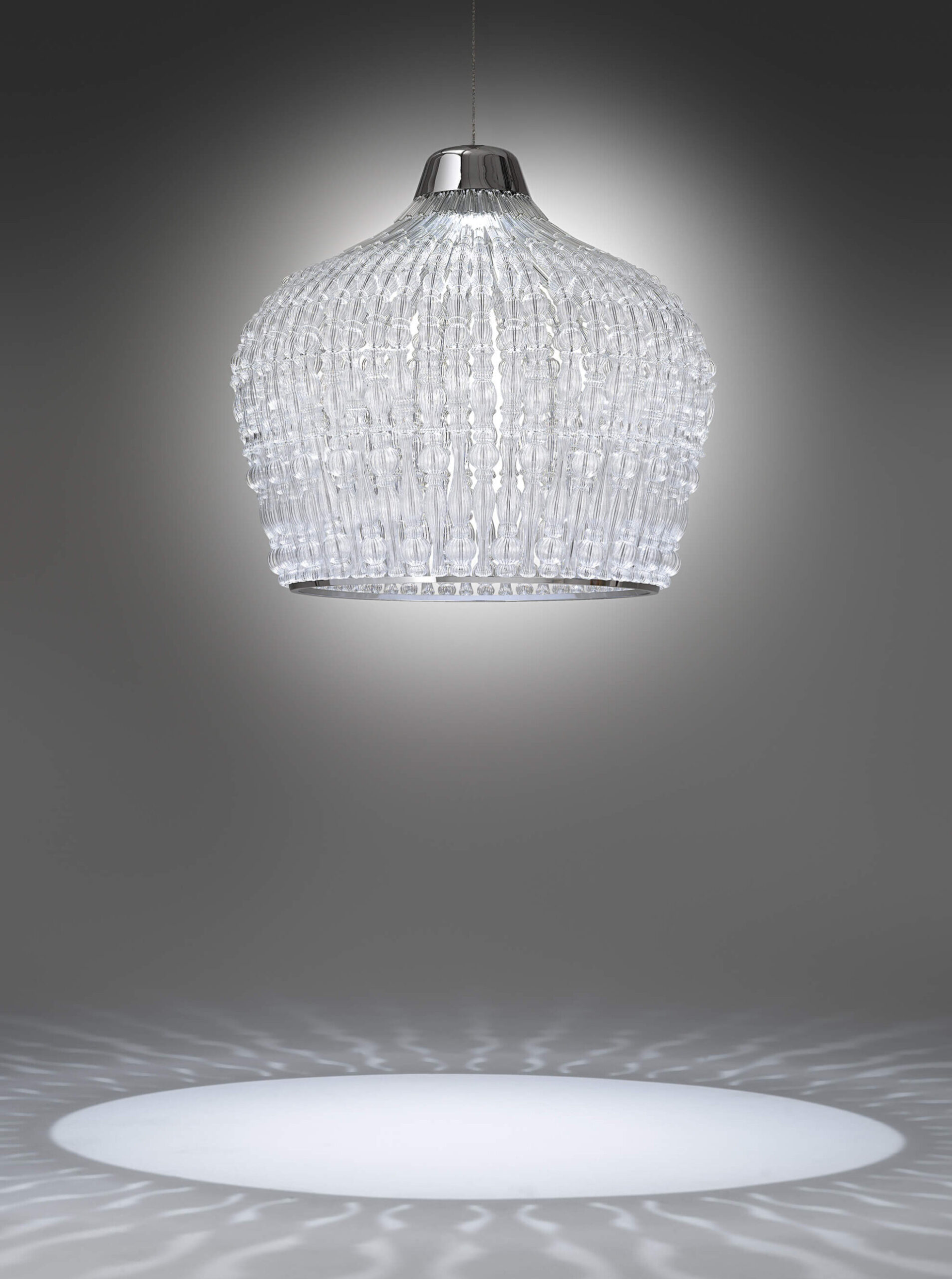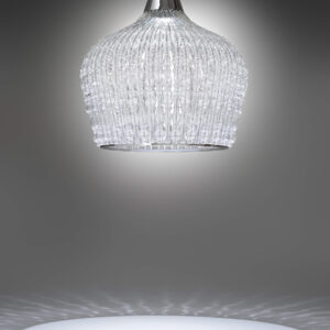 Pendant with chrome metal structure and blown glass elements. Available in different dimensions and colours.
