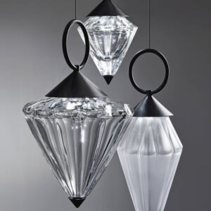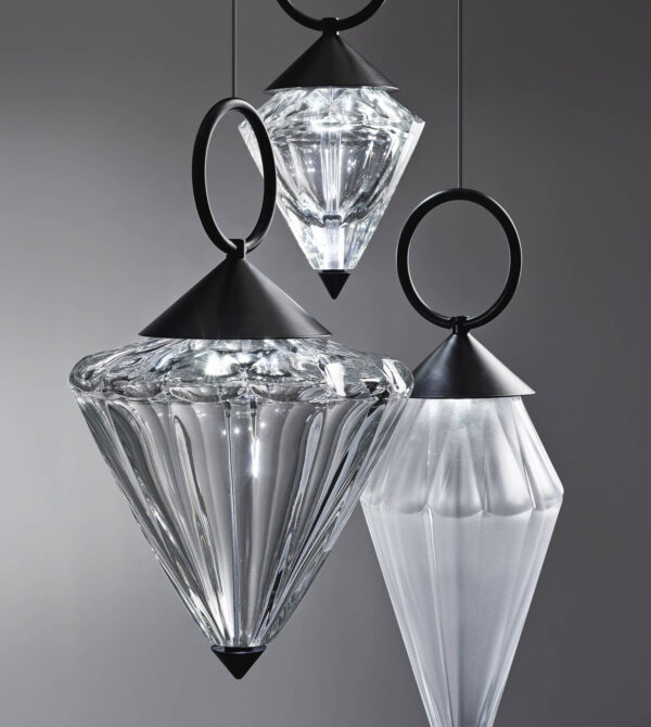 Pendant lamp with transparent or etched blown crystal diffuser. Metal structure with matt black, iron grey or light gold finishes.