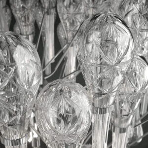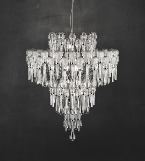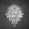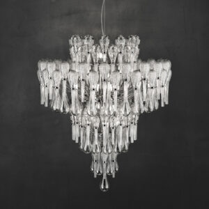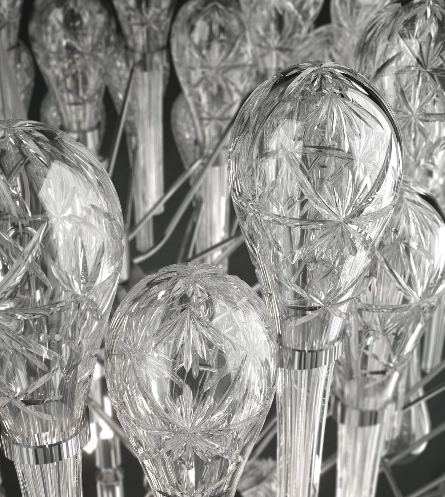 Chandelier in carved crystal, metal with nickel finish and crystal dust. Available in different dimensions.