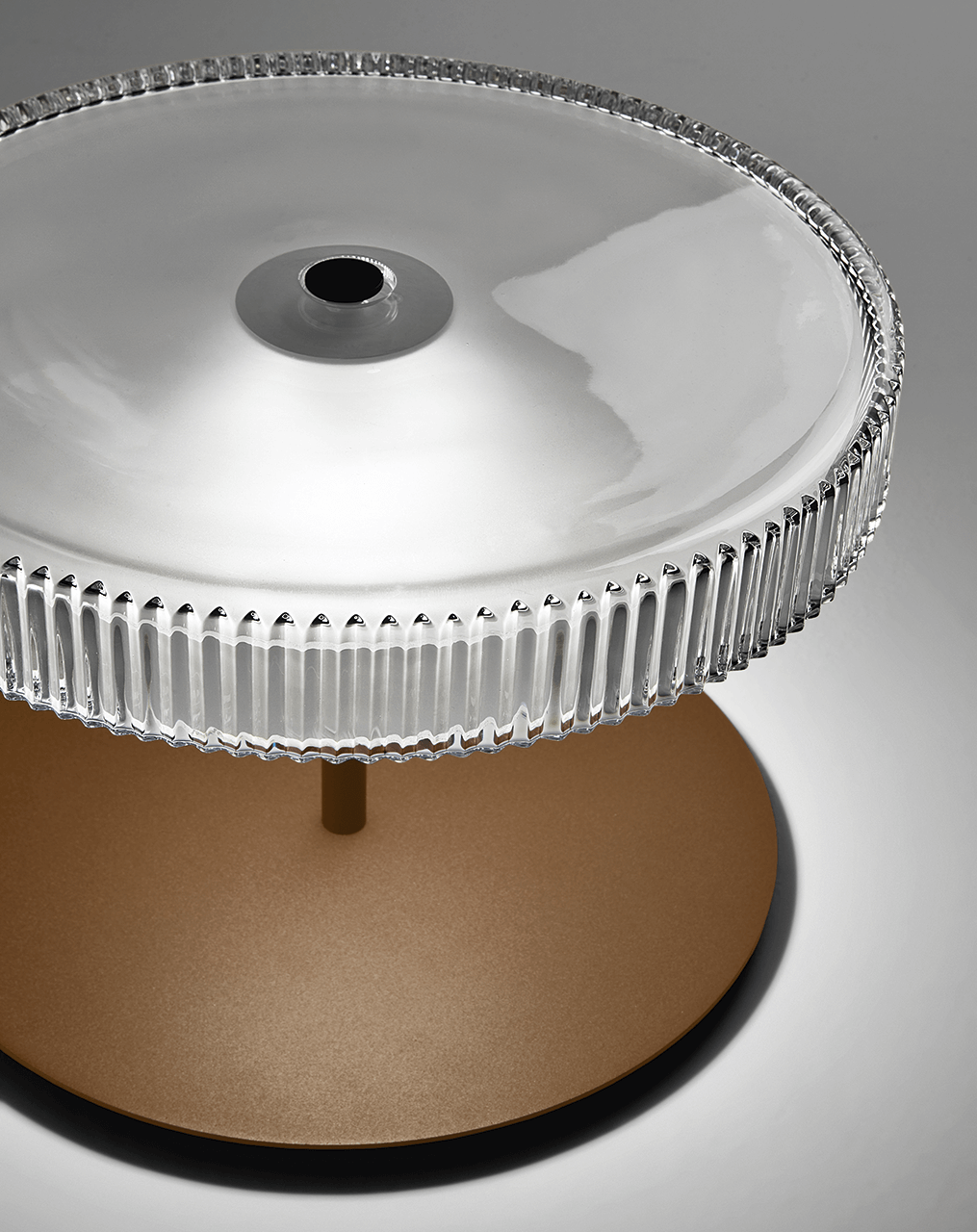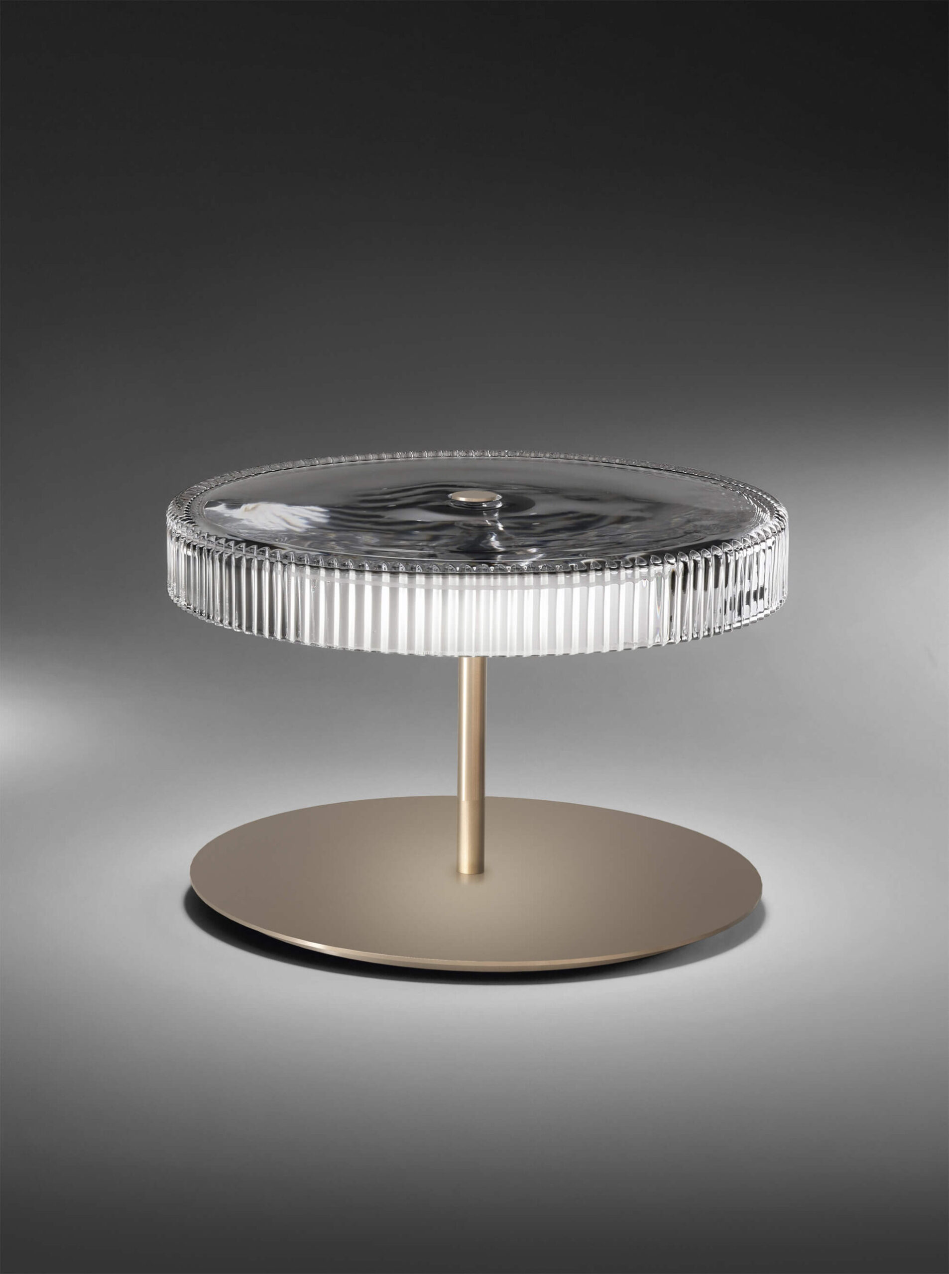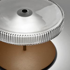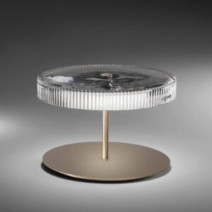 Table lamp, with hand-carved crystal diffuser. Structure and metal details in satin corten or matt champagne finish.