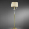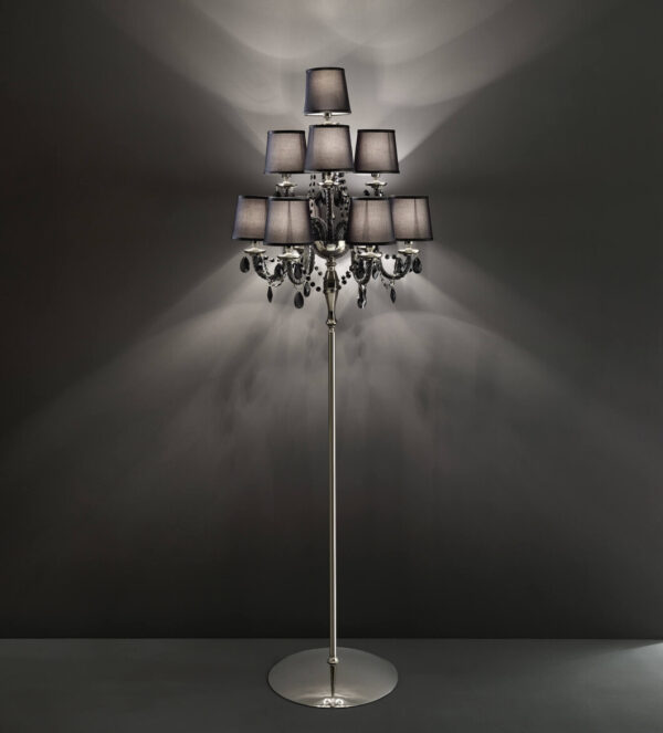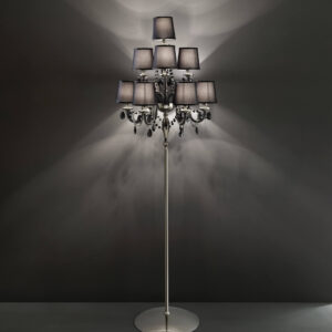 Floor lamp in clear or black carved glass, metal structure with chrome or iron grey finish, white or black fabric shades and crystal pendants. Available in different dimensions and colours.