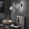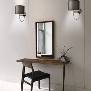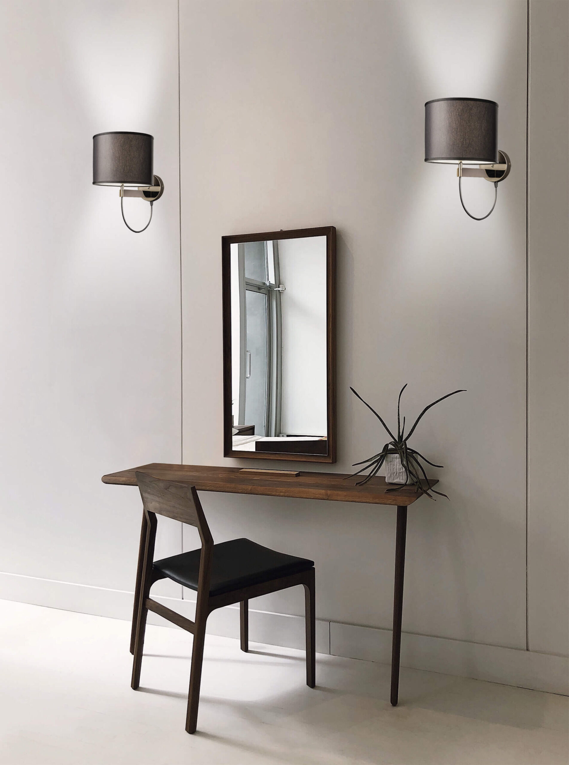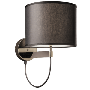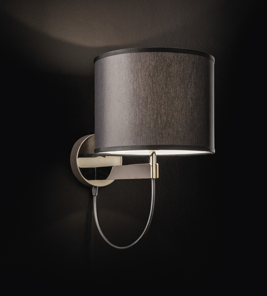 Table, floor and wall lamps in metal with light gold finish and fabric diffuser. Available in different colours.