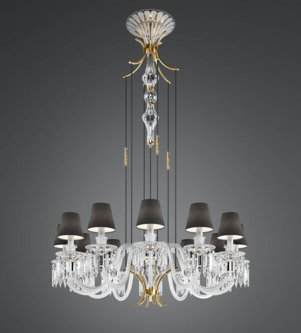 Suspension in crystal and artistic glass. Lampshades in anthracite fabric. Supporting structure in metal with matt black finish. Metallic decorative details with light gold finish with stones.