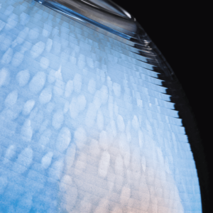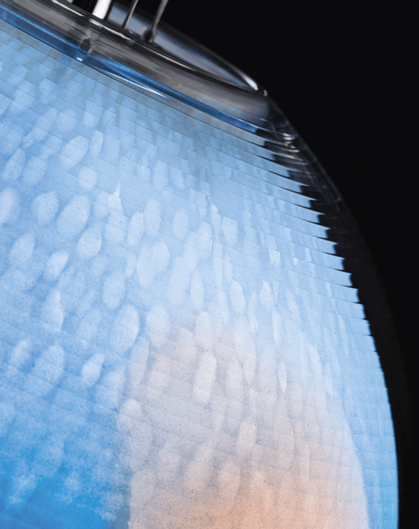Pendant with blown white glass encased in a clear ruled dome with copper shaded finish. Chrome metal structure.