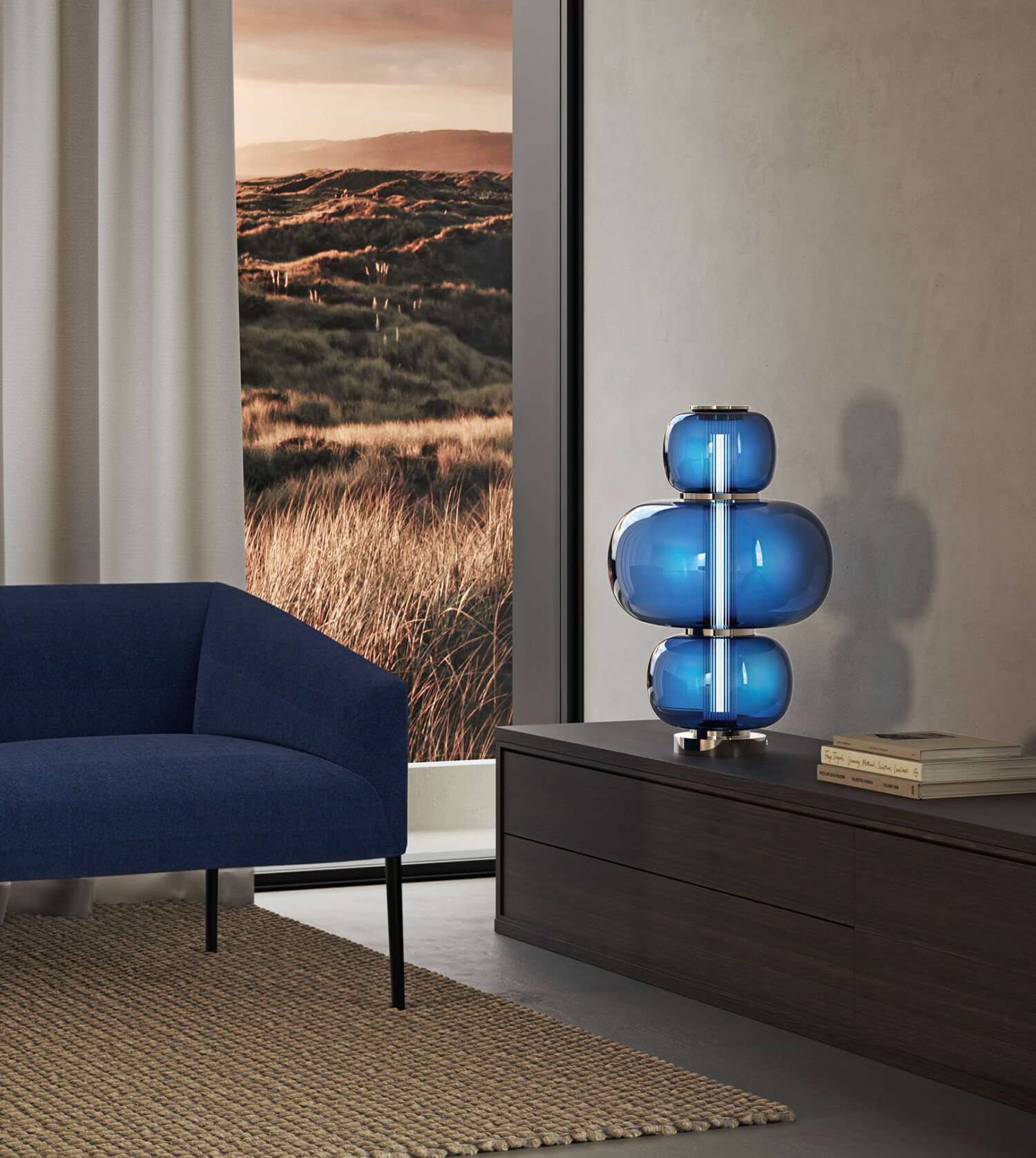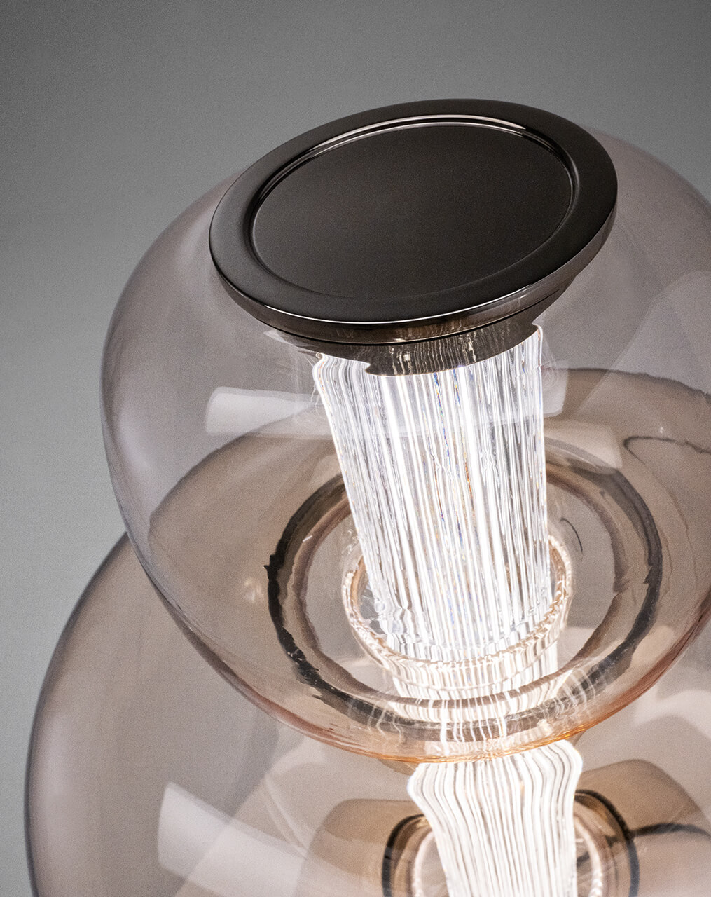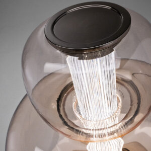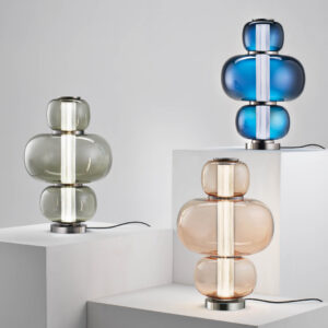 Table lamp in Murano glass, composed of three volumes in the three colors: Blue avio, Fumè and Salmon pink. Hand-carved crystal diffuser. Metal structure with iron grey finish.