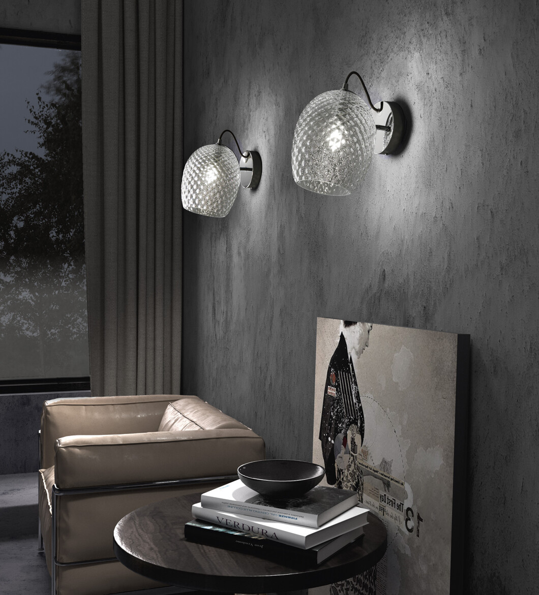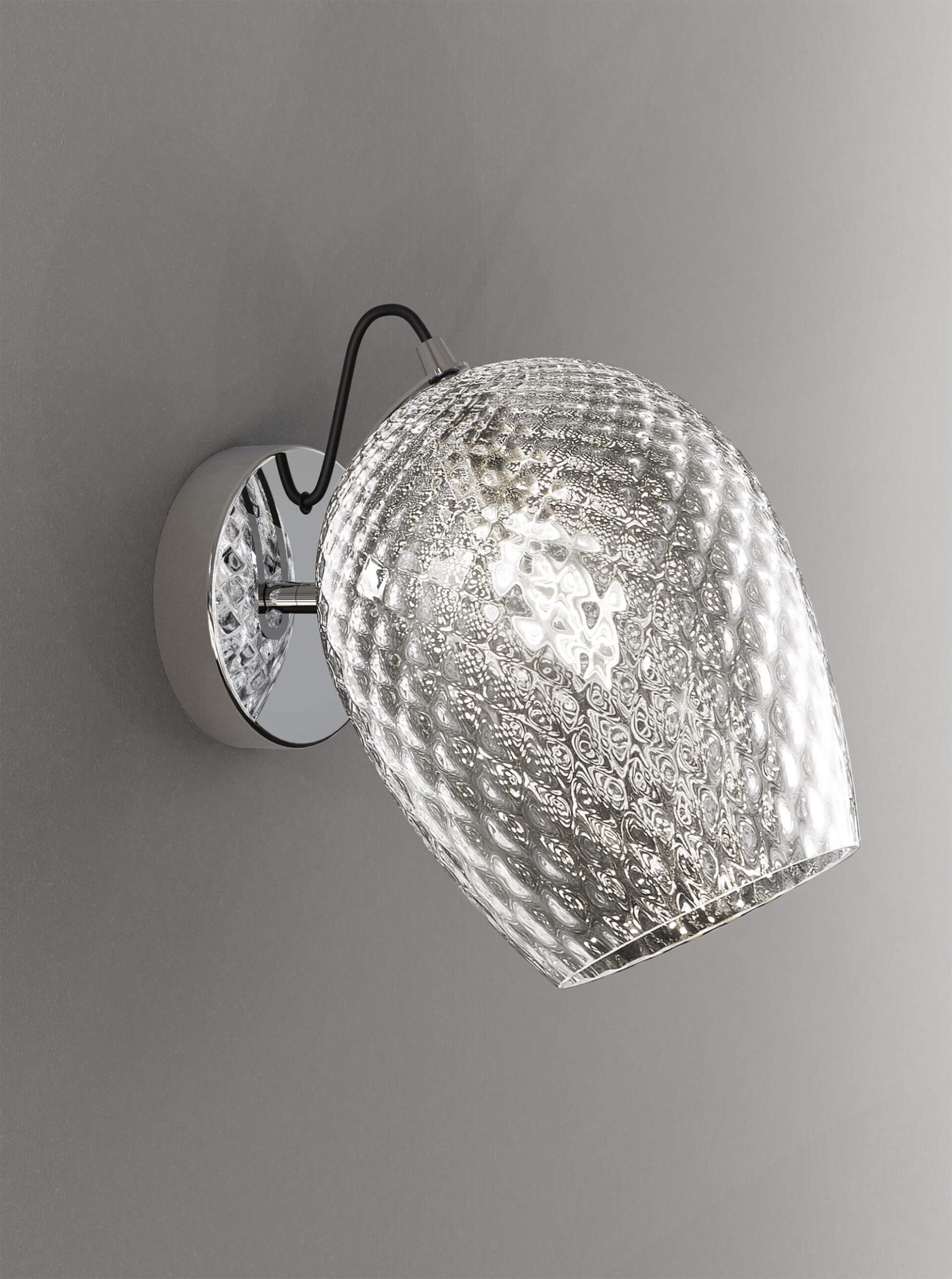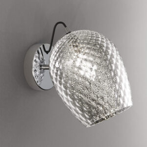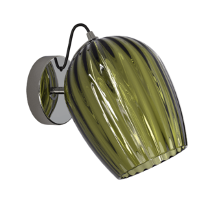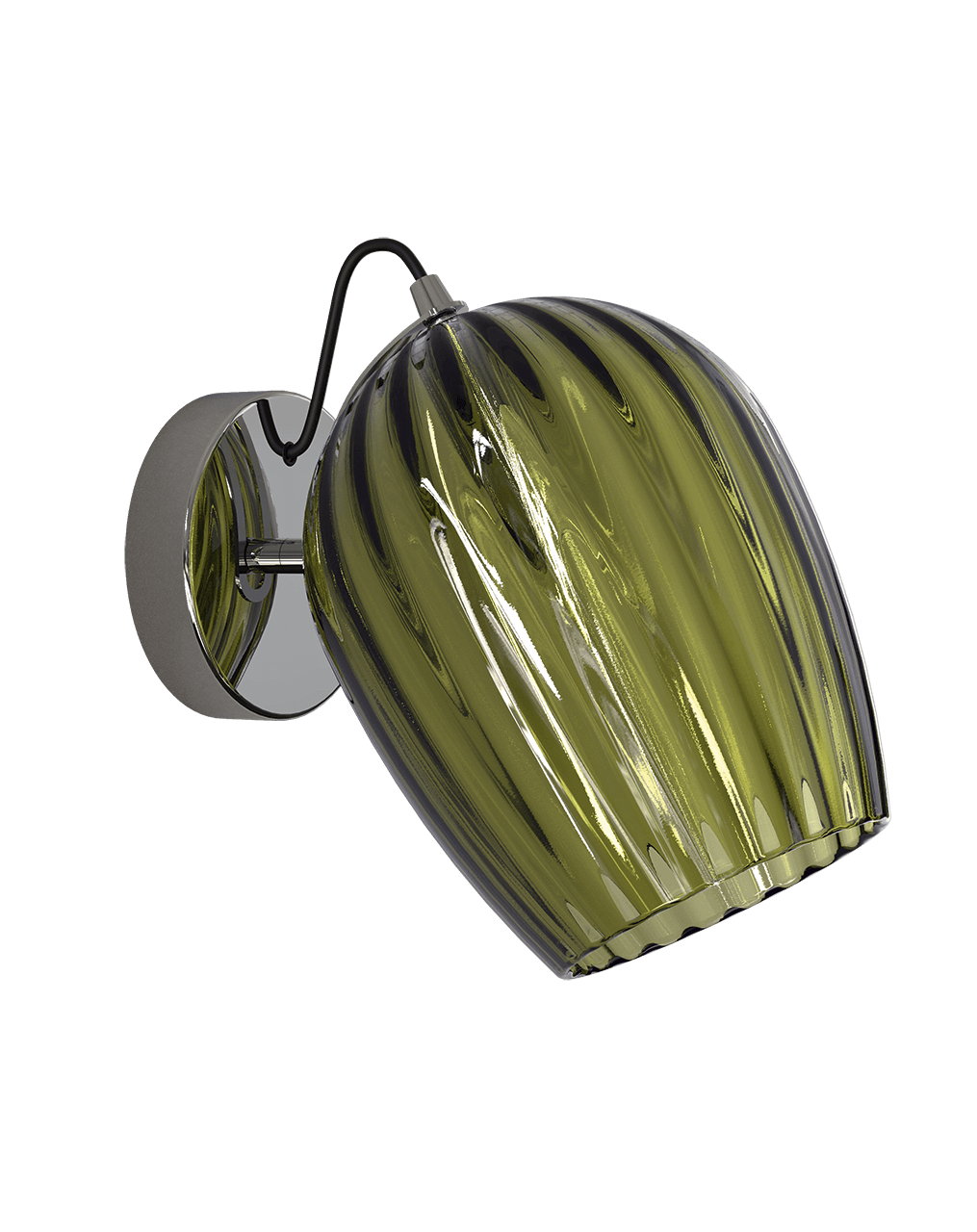 Wall lamp with blown glass diffuser available in four glass finishes and colours: clear, fumé, dove and olive green, metal with chrome or iron grey finish.