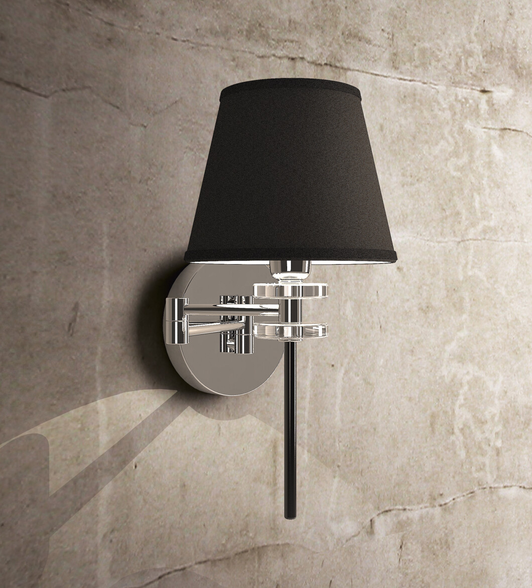 Wall lamp in metal with chrome, black or white finish and glass details. Black or white fabric shade.