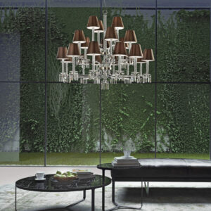 Chandelier in light gold and chrome metal finish, crystal details and crystal or glass pendants. Brown or blue fabric shades. Available in different dimensions.