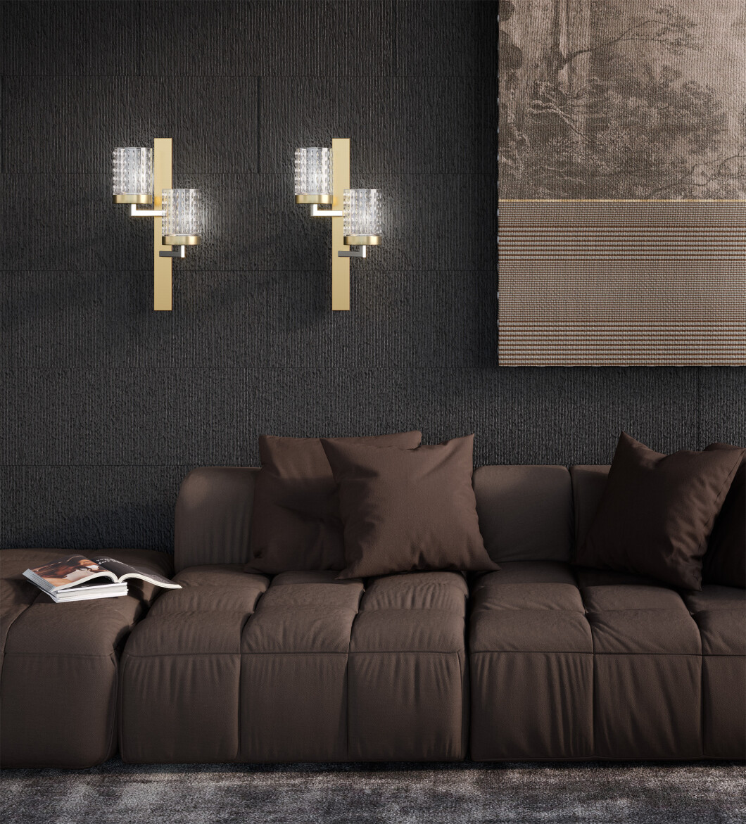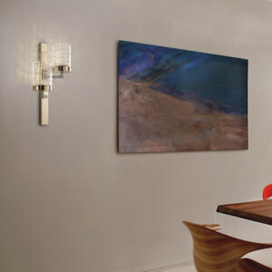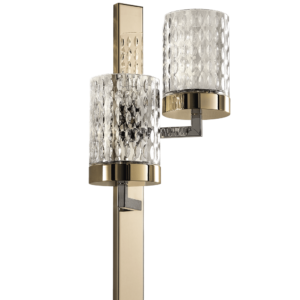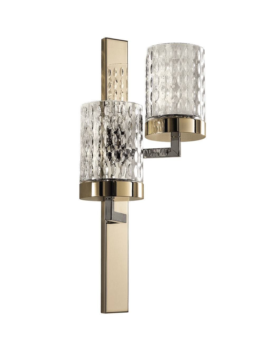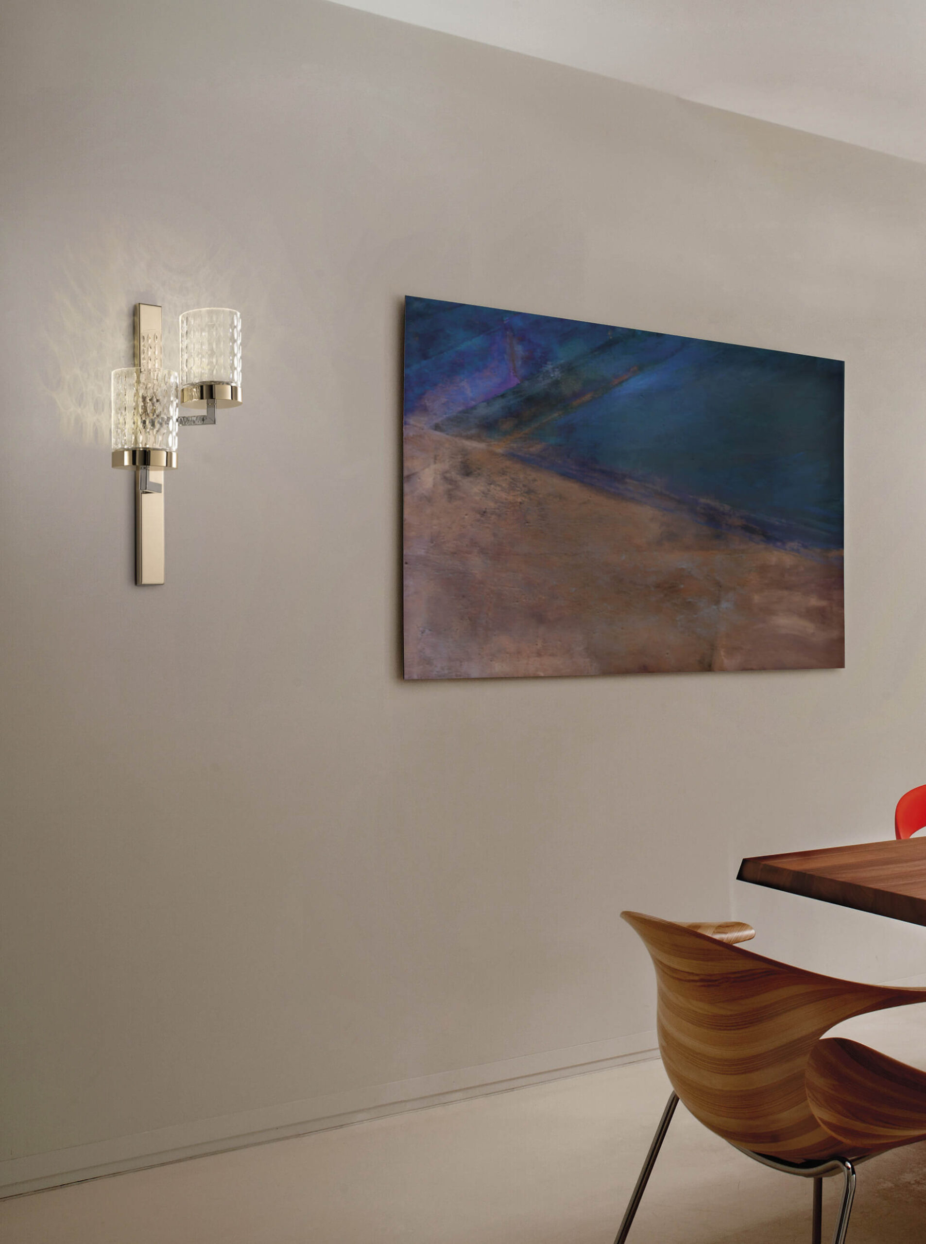 Wall lamp with metal structure in light gold and chrome finish with hand cut crystal diffusers. Available in different dimensions.