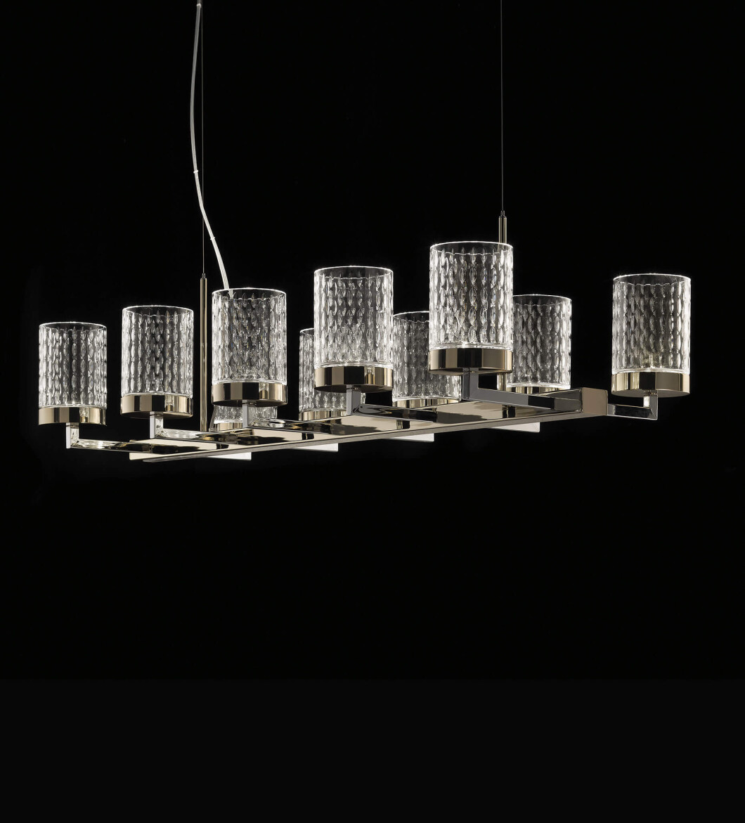 Chandelier with metal structure in light gold and chrome finish with hand cut crystal diffusers. Available in different dimensions.