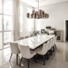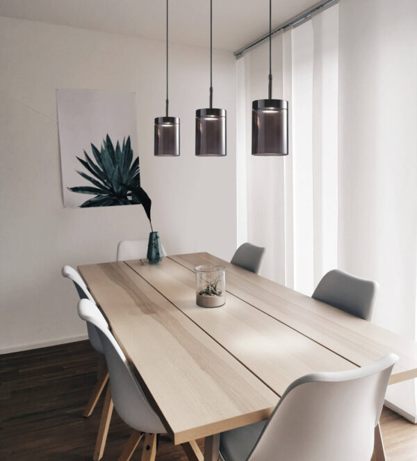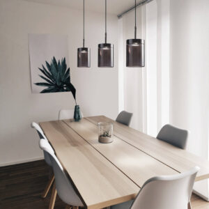 Chandelier with metal structure. Diffusers in dove crystal colour and black bronze metal finish. Available in different dimensions.