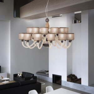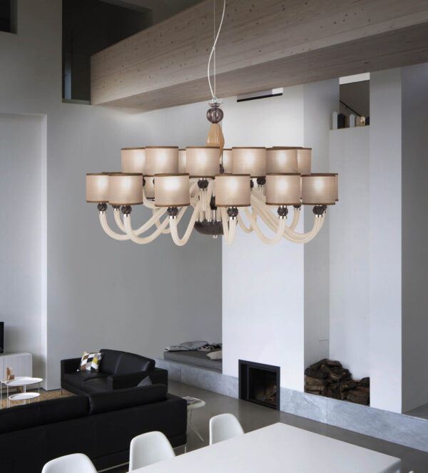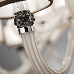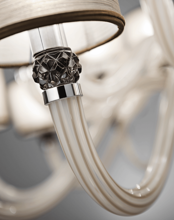 Chandelier with striped glass arms and dove and black carved crystal details. Mud fabric shades. Metal with chrome finish. Available in different dimensions.