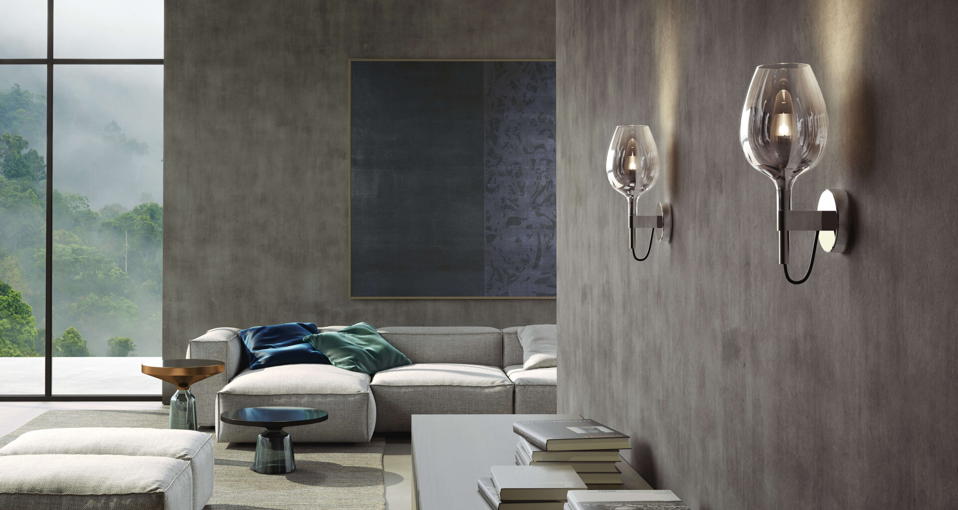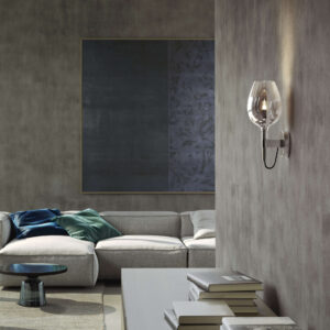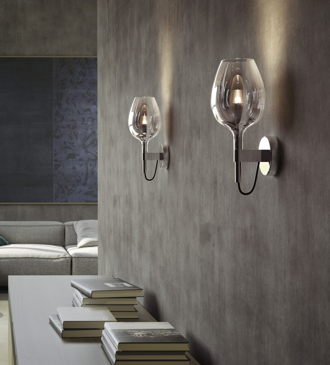Wall lamp with blown glass diffusers and metal structure with iron grey, gold or chrome finish. Available in different colours.