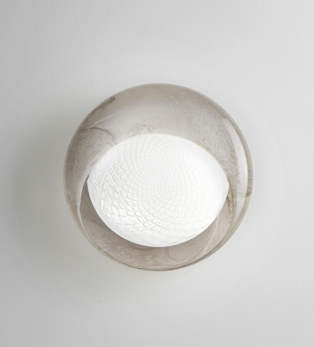 Wall lamp composed of two artistic blown glasses, external glass in alabaster, black or milky white finish, internal diffuser with “Ballotòn” texture.