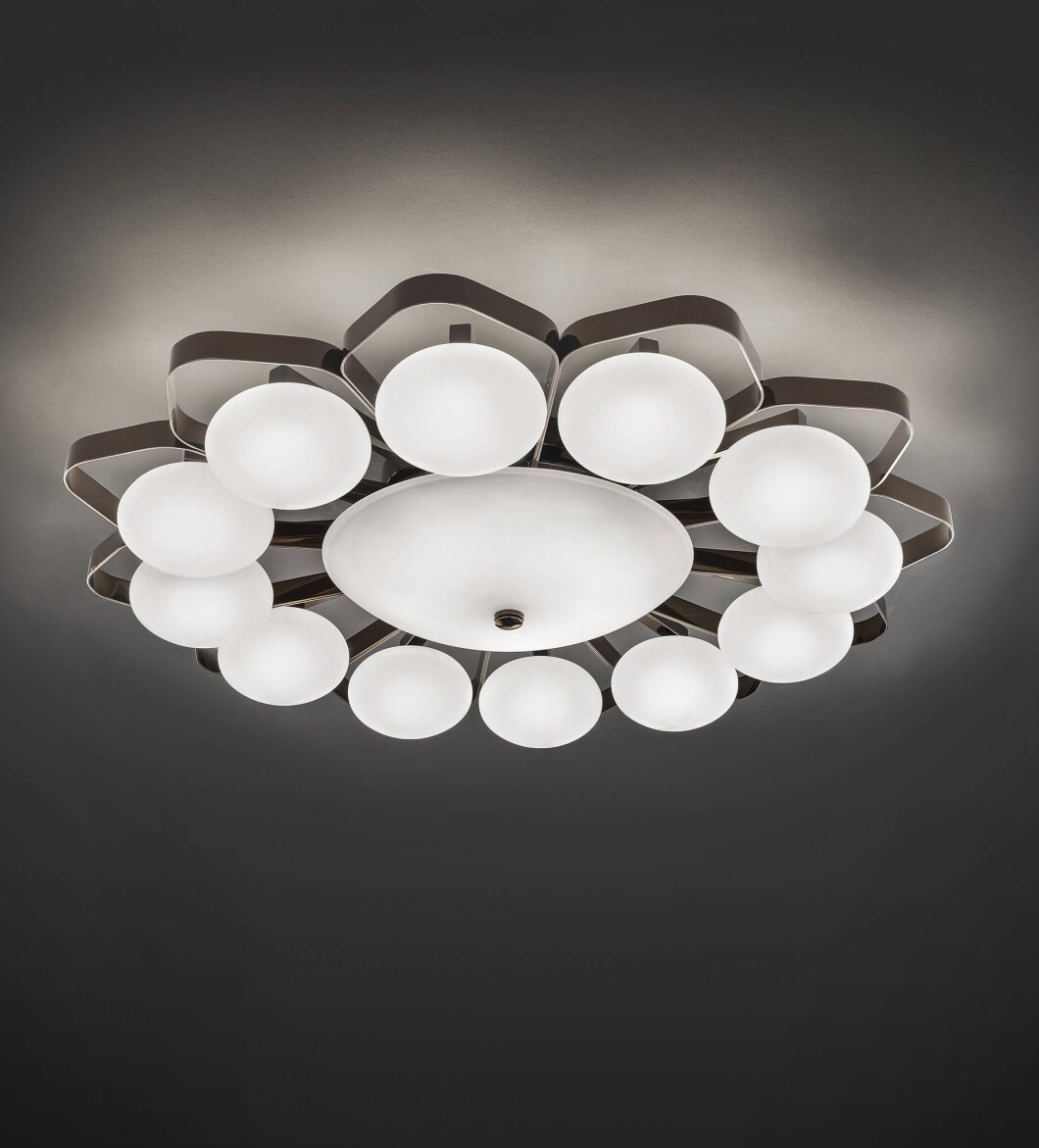 Ceiling lamp in gold nickel metal finish and blown satin glass diffusers. Available in different dimensions and colours.