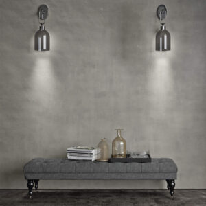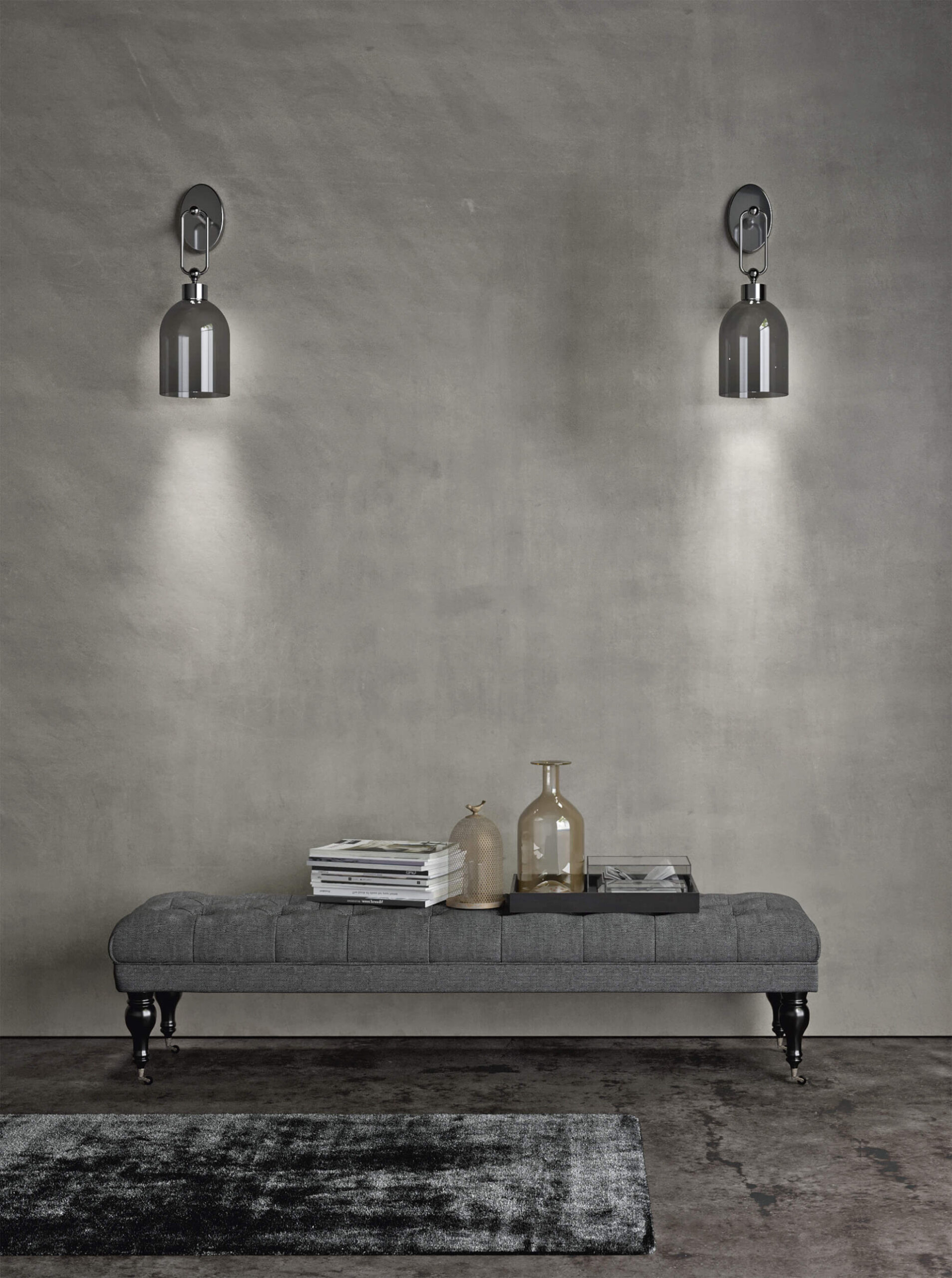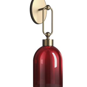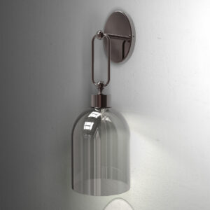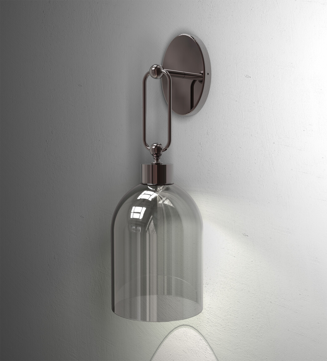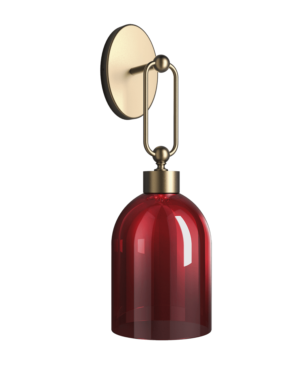 Wall lamp in metal with iron grey or brushed gold finish and red or fumè glass diffuser.