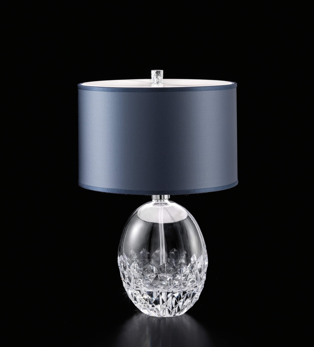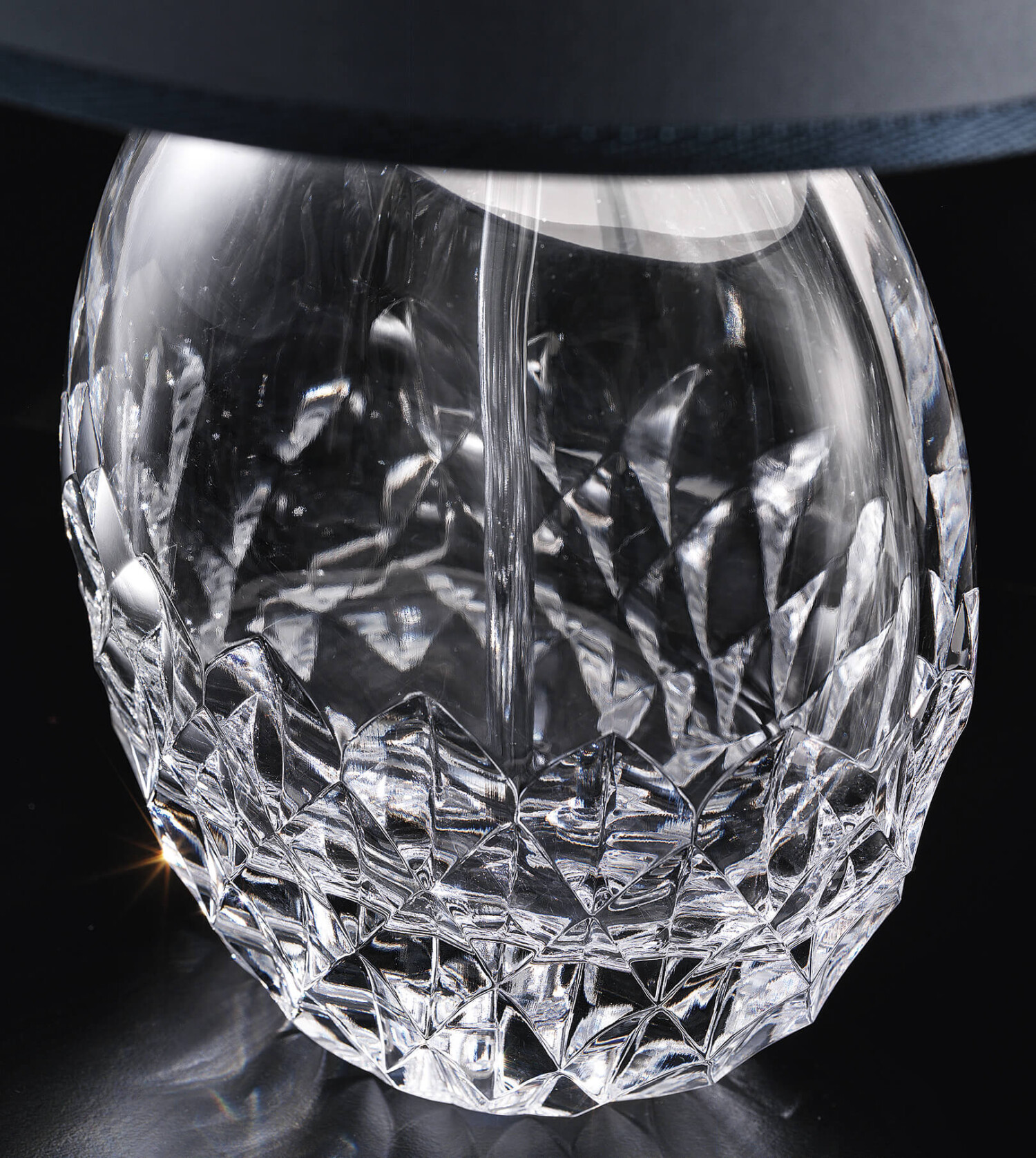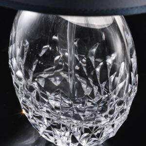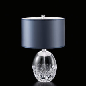 Table lamp in clear carved crystal with blue sugar paper fabric shade. Metal details with chrome finish.