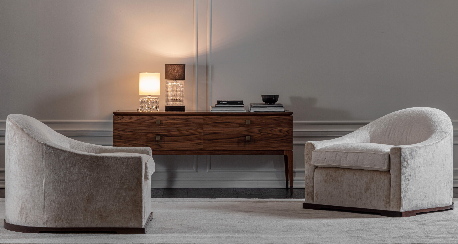 Table lamps in crystal with chrome metal finish and pink or bordeaux fabric shade.