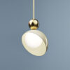 Suspension with structure and decorative parts in metal available in Ancient White, Yellow Sunrise, Baby Blue, Baby Pink and Cappuccino. Middle sphere with brushed light gold finish. Diffuser in white glass.