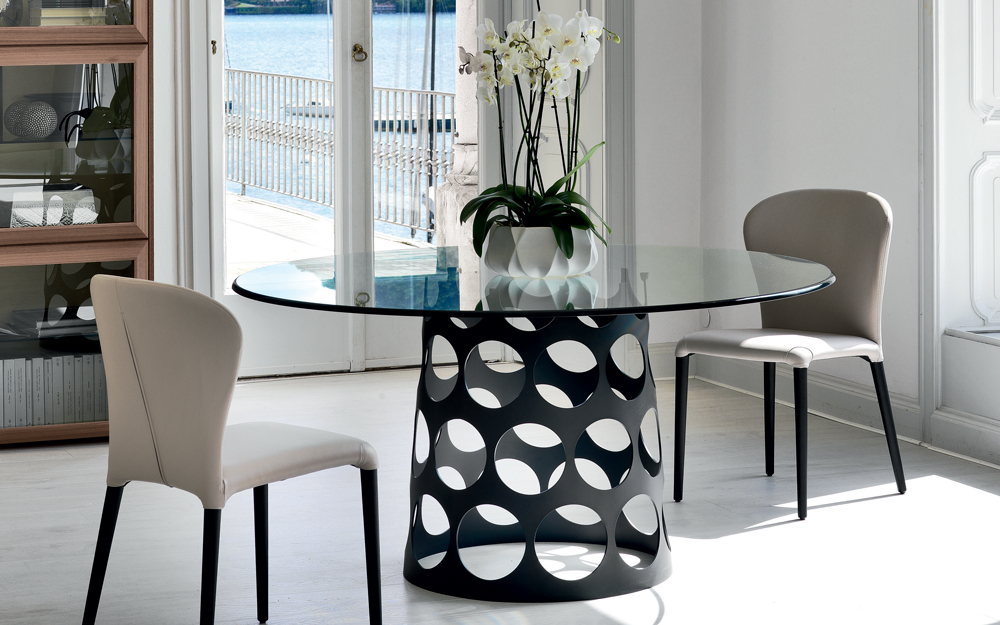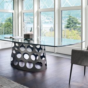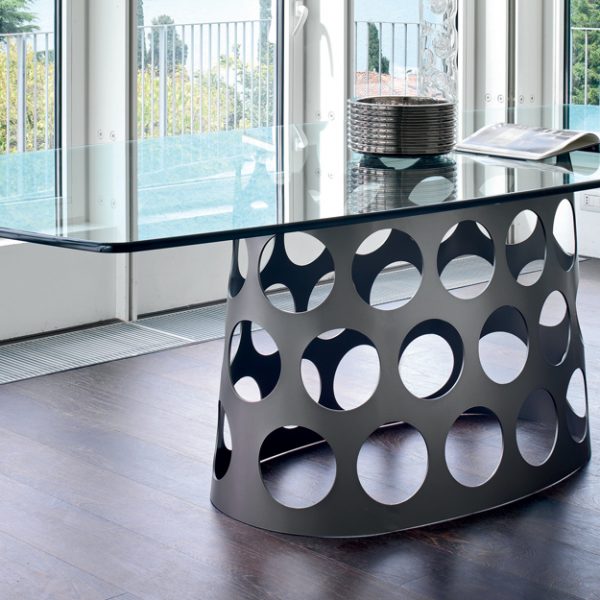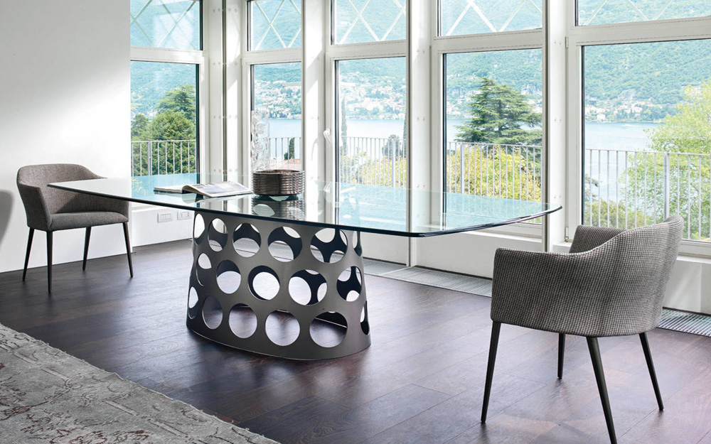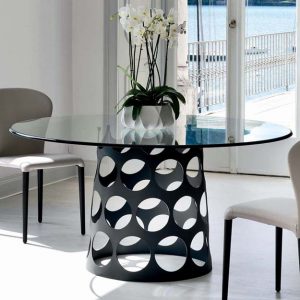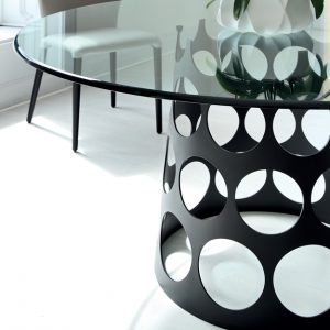 The Jean features an iconic metal base with statement cut-out details complemented by a 15mm-thick round transparent clear glass top. The table is available in a choice of round or barrel-shaped designs in a variety of sizes.