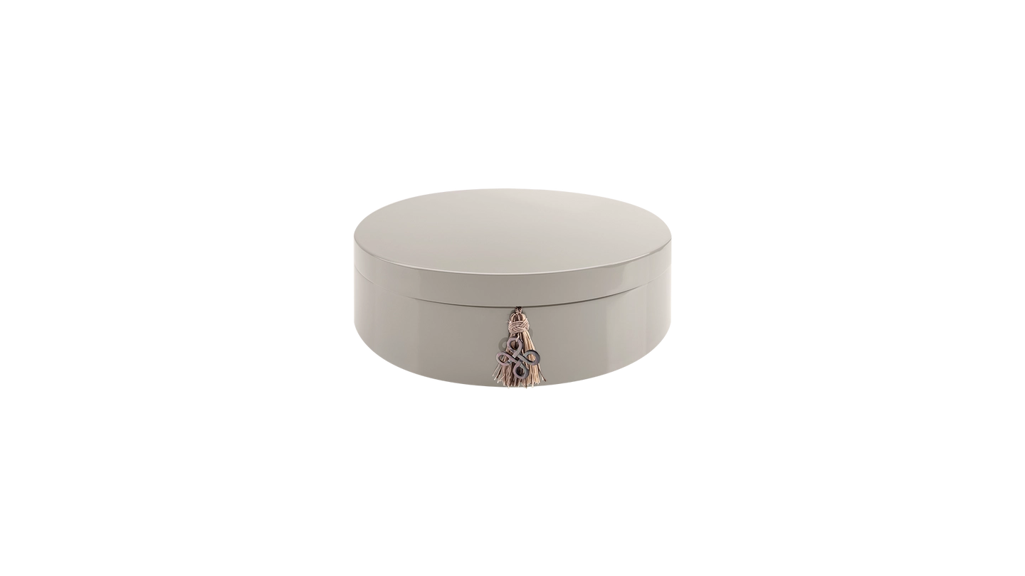 A seamless and cylindrical lidded box moulded from glossy lacquered wood, the JEDDAH is opened with the aid of a white mother-of-pearl pendant in the shape of an endless knot, a propitious symbol that represents infinite wisdom, compassion and the ultimate unity of everything.