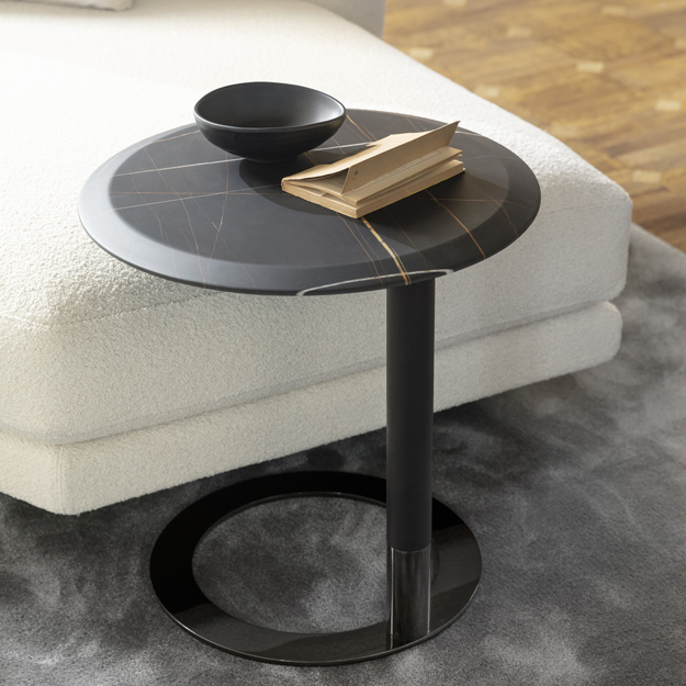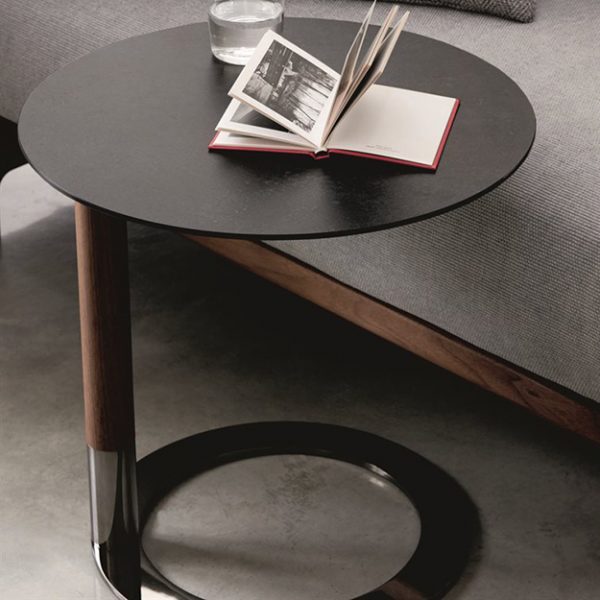 A practical and contemporary circular side table, the Jok features a top surface that can be selected in a variety of stylish wood, glass, Rock or marble finishes. This is complemented by a Canaletto Walnut frame and a circular metal base, both in a choice of finishes. Please note that the Rock tops feature a flat edge-to-edge shape, and all other finishes feature a bevelled edge.