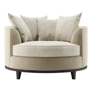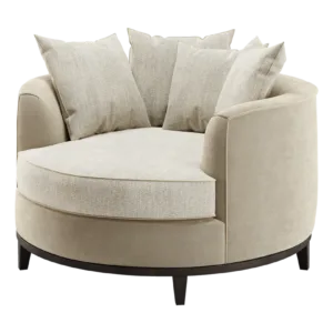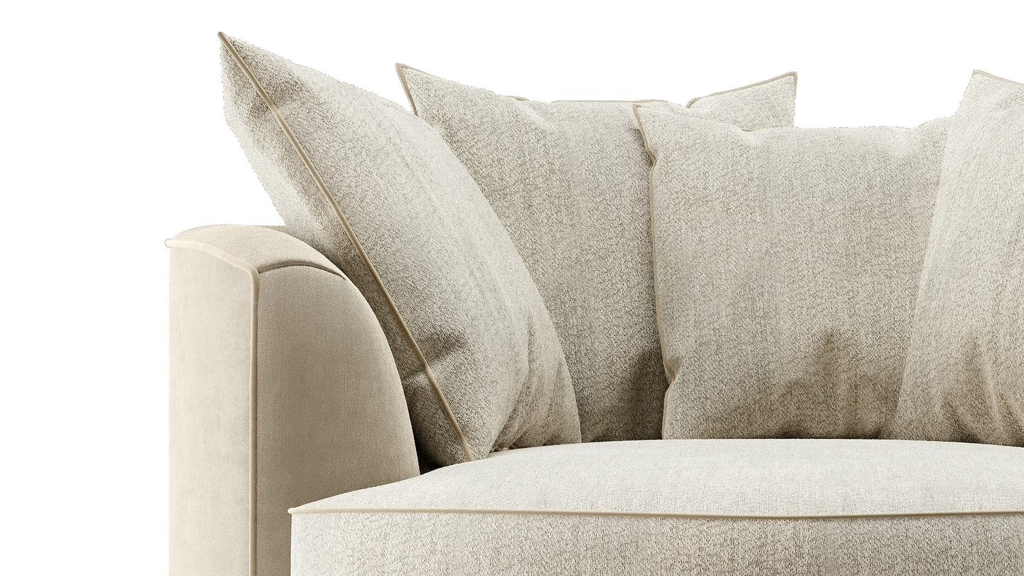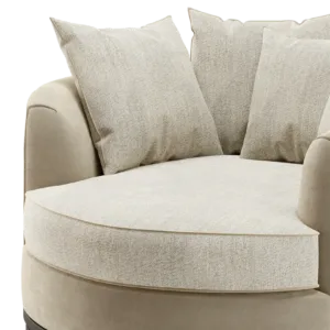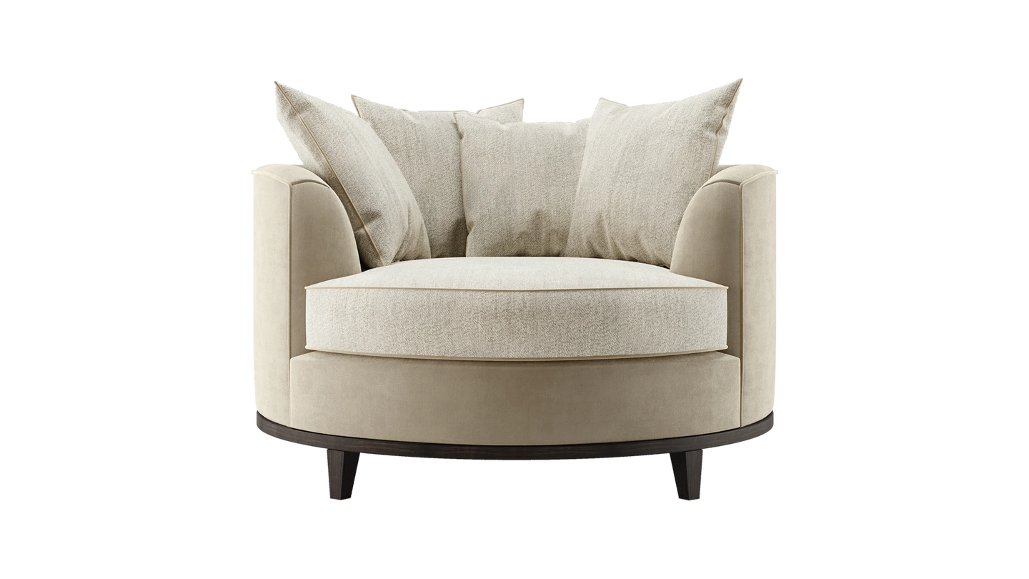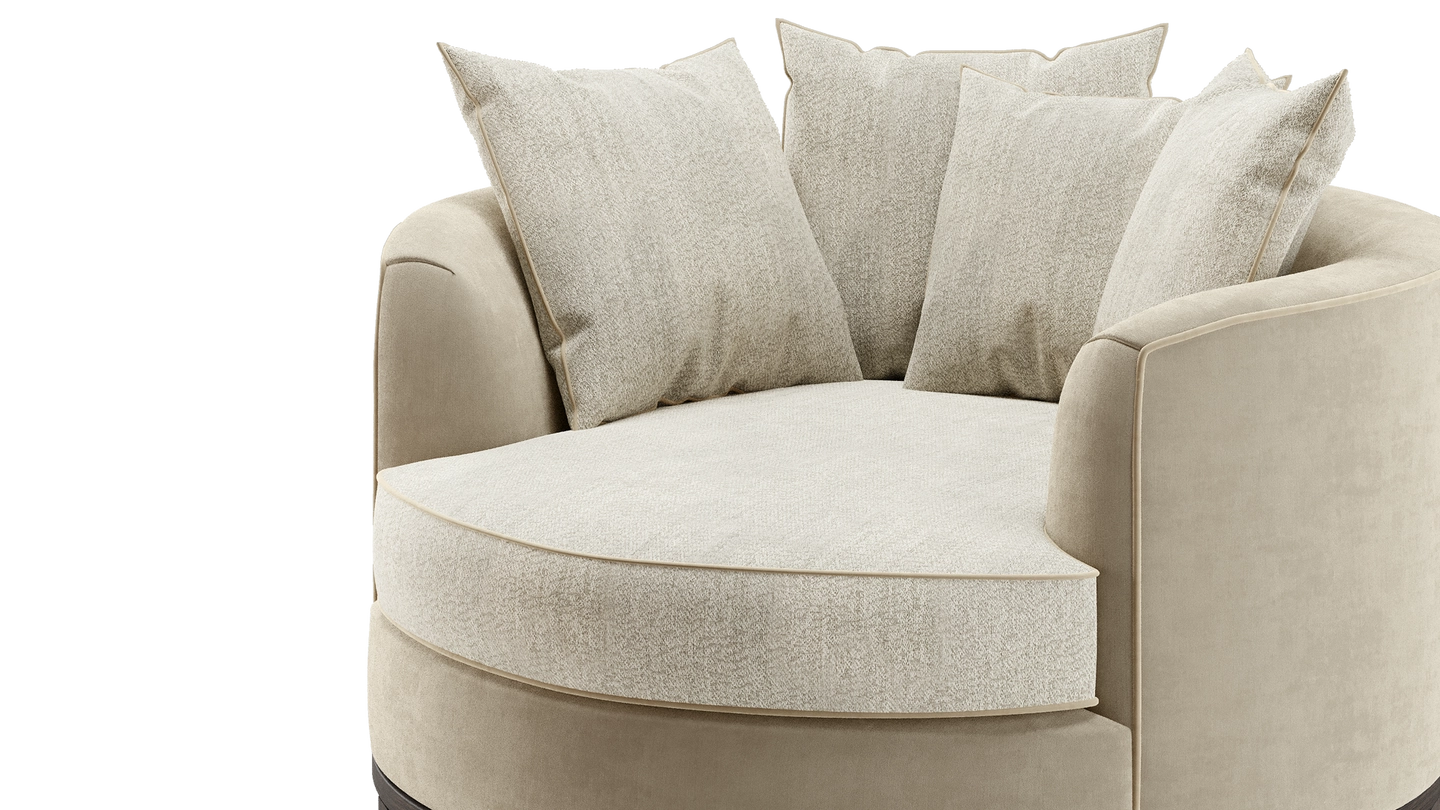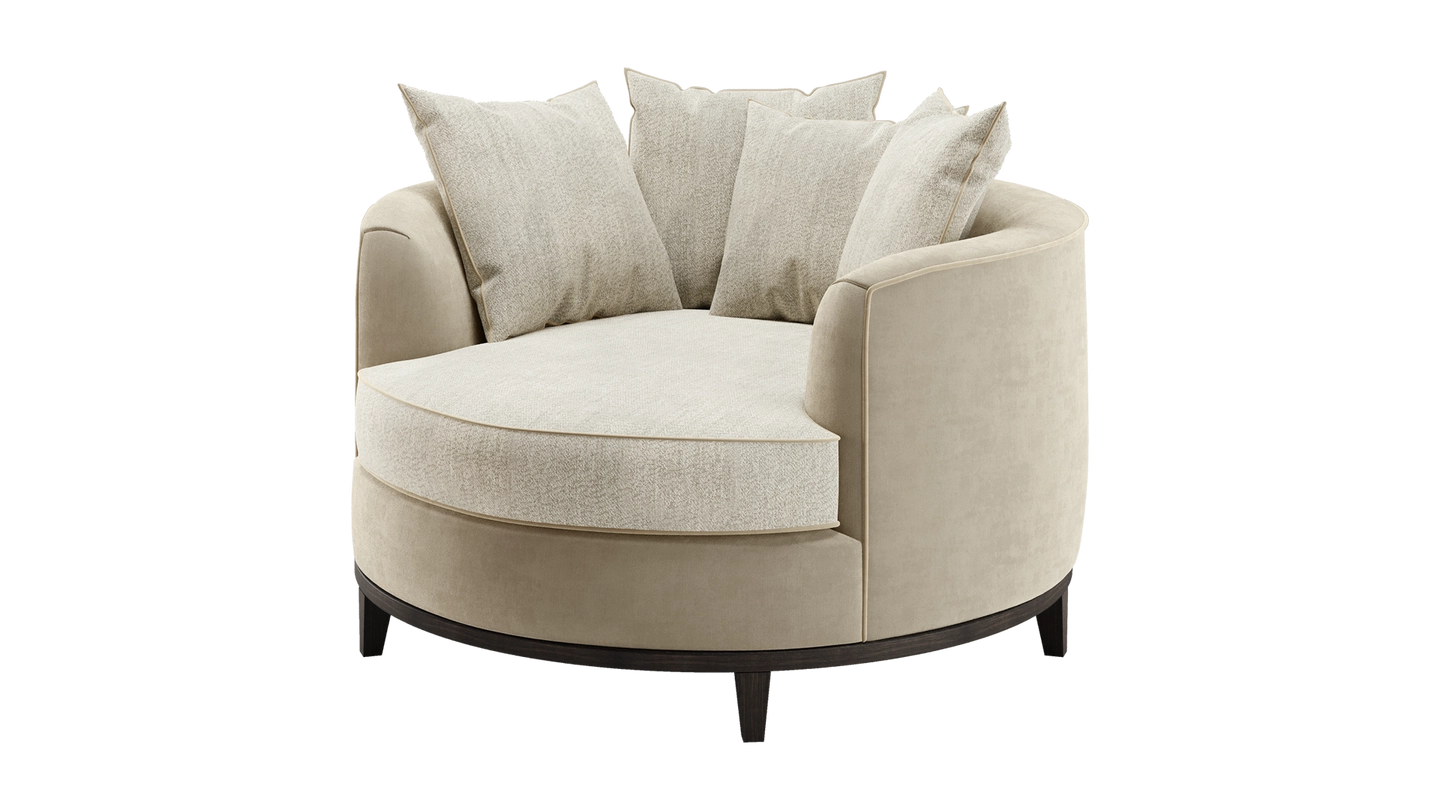 The loveseat-style KANSAS offers a different perspective on sofa design. A true circle filled with plump cushions, it invites you to curl up in absolute comfort. Signature design details include contrast upholstery and a solid wood base.
