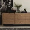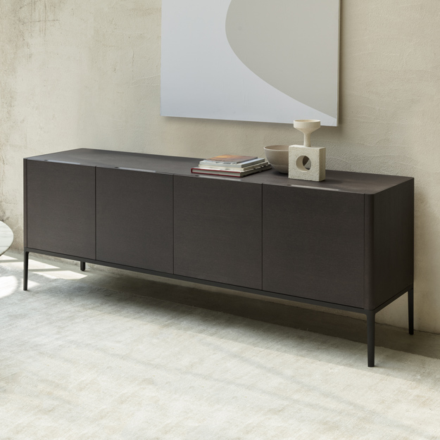 The Kanto Sideboard is an elegant design featuring four cupboards, two with two glass shelves, all in a rectangular shape with neatly curved ends for a seamless appearance.