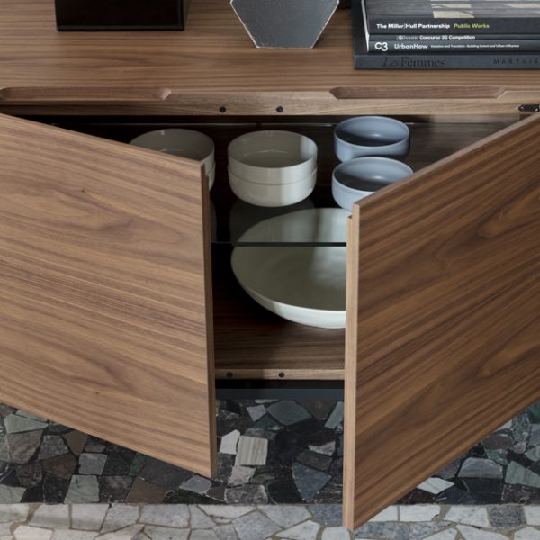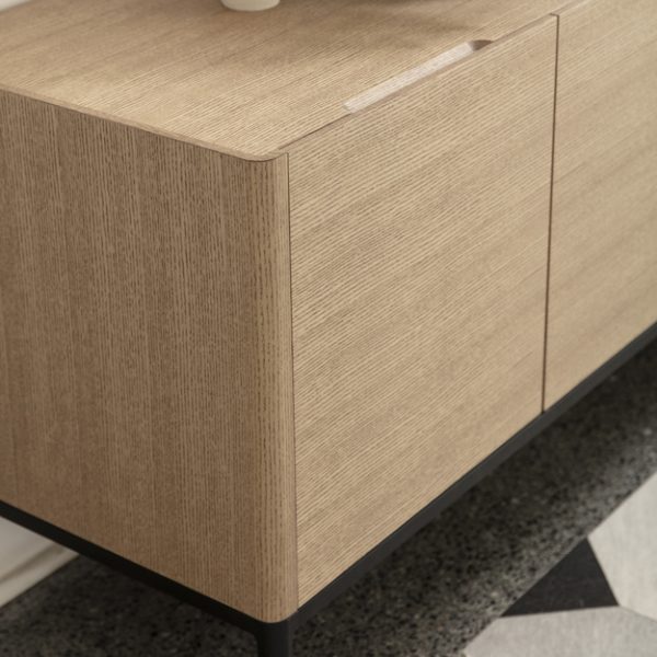 Cutaway handles are detailed to the front of the top, for a subtle twist. Kanto is available in a variety of ash or canaletto walnut finishes, with a matt black metal base and rounded legs.