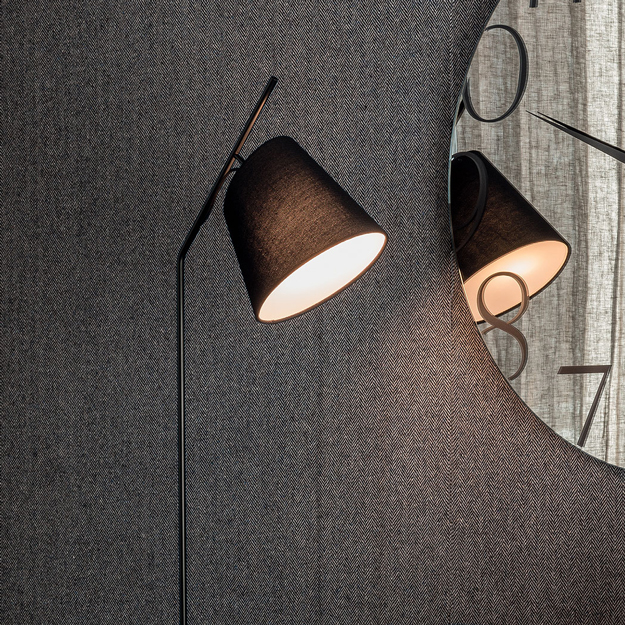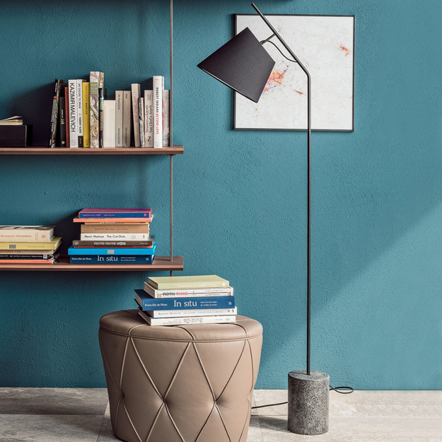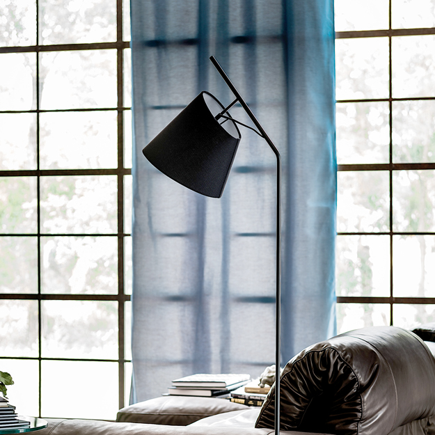 The distinguished Karibu floor lamp features a solid circular cement base with an elegant black lacquered steel frame, which is is complemented with a striking lampshade in an angular shape and finished in black cotonette fabric.