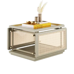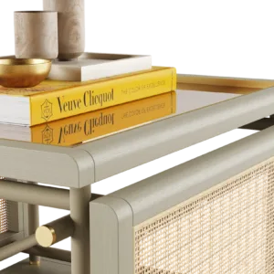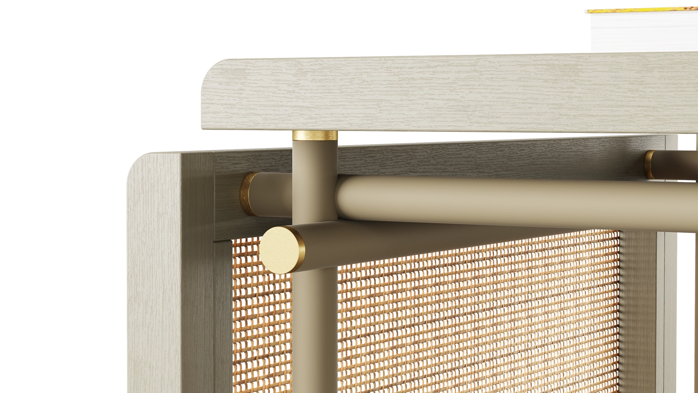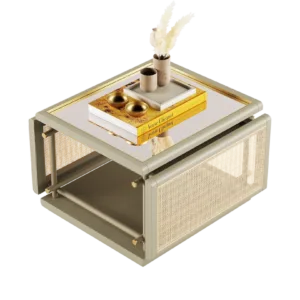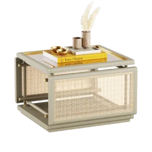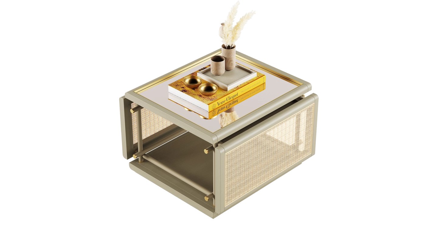 The KEA Coffee Table is a striking centrepiece, combining satin open pore wood and rattan. A bronzed mirror top and brushed brass details bring an easy air of elegance.