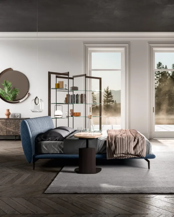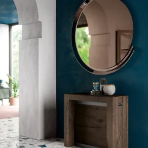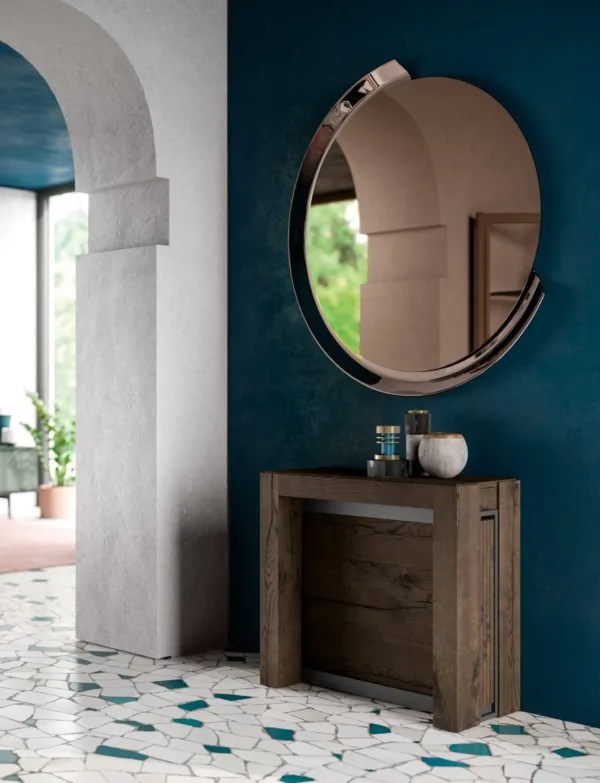 The geometric perfection of the circle meets the elegance of the glass frame and, together, make us feel the sensation of a crescent moon orbiting in our room. A simple shape, made important by the reflection of the concentric reflecting arch that is reflected on the wall giving a sweet brightness. A mirror able to embellish and illuminate every night.