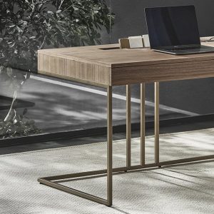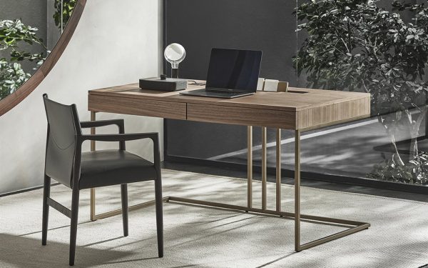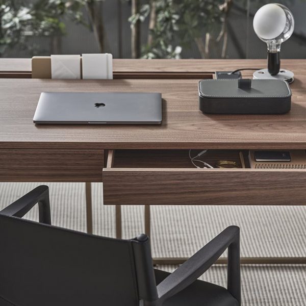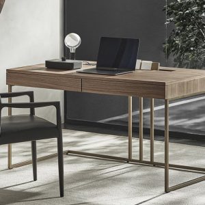 Kepler is a contemporary writing desk in solid canaletto walnut wood with a slender metal base in brushed bronze brass metal. The desk features two drawers, an additional storage section on the desktop for smaller items and a cable management hole for an organised finish.