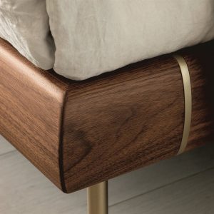 The solid wood frame comes in a choice of Canaletto Walnut finishes and is complemented by sleek brushed brass feet. Optional 53cm high bedside tables are available with the 130cm headboard. Mattress not included.