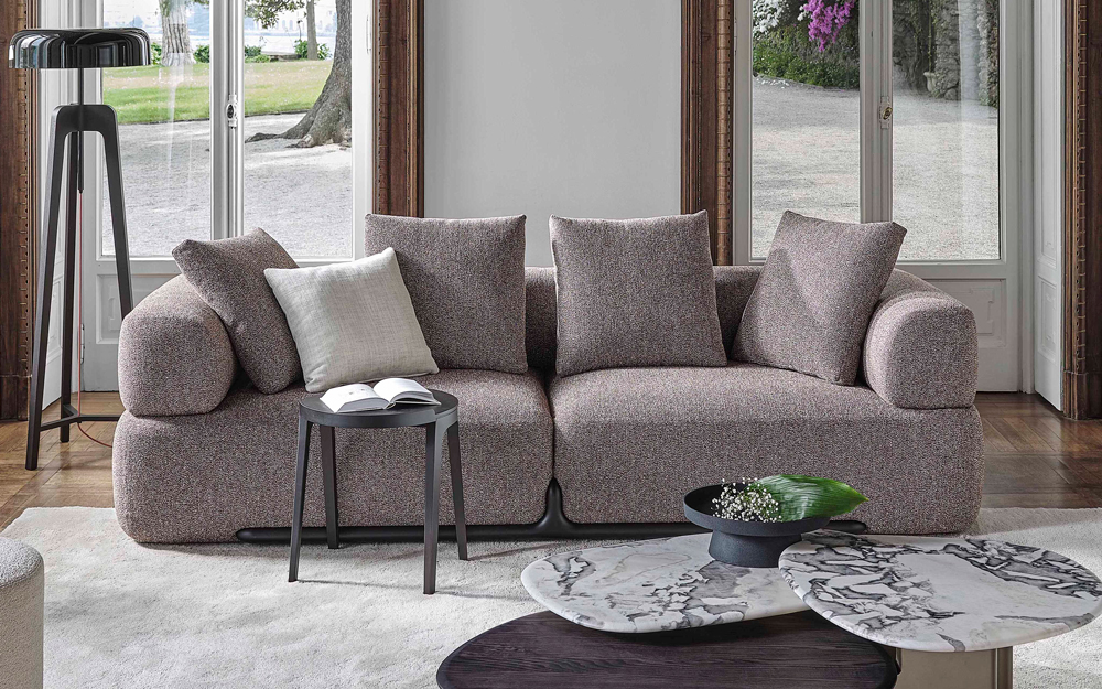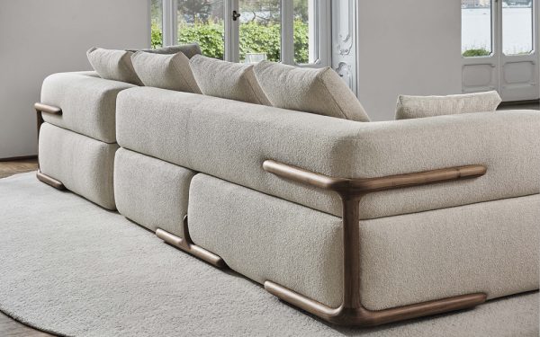 The Klem is a sumptuous sofa featuring contemporary bold curves, with low armrests and backrest punctuated by loosely spaced pillow-style back cushions. The design is completed with a smooth canaletto walnut wood frame detail.
