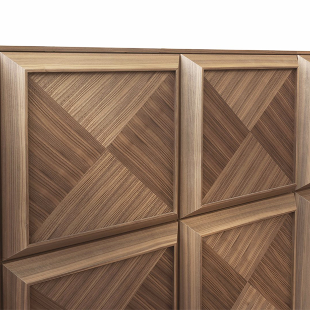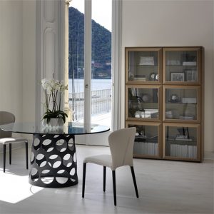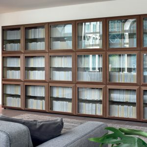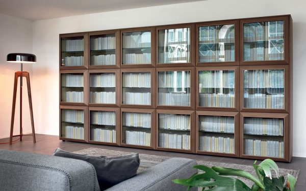 The Kvadro is a versatile doored bookcase available in a range of modular compositions featuring smoked glass or inlayed canaletto walnut wood doors set into a raised angular wood frame for a bevelled look.