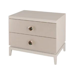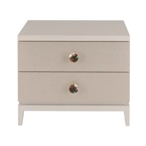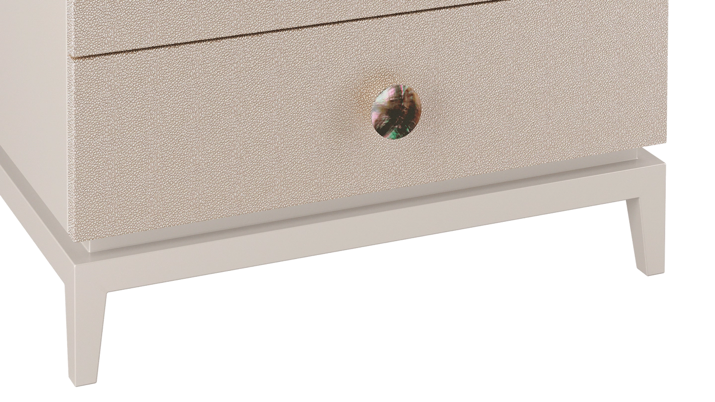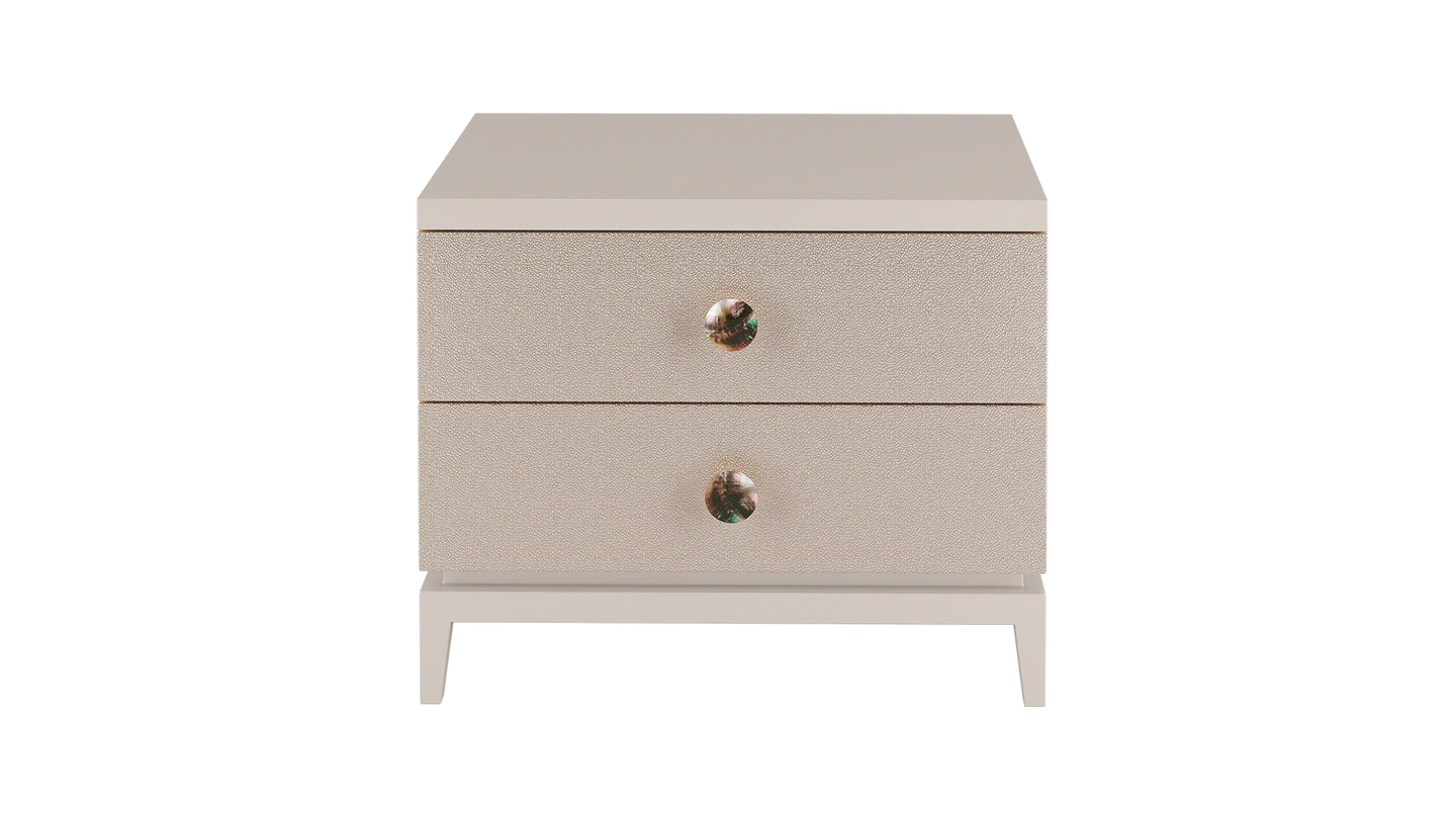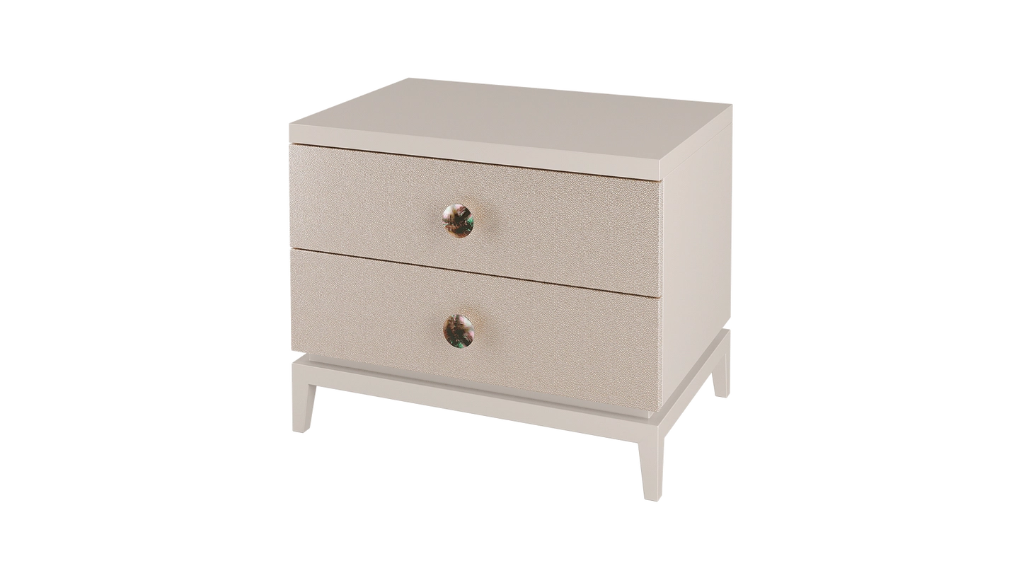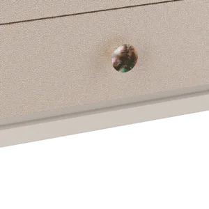 A chic two-drawer design, the streamlined LAGOA Bedside Table is fashioned from glossy lacquered wood in a restful and versatile shade of grey-beige. Tonal leather fronts add texture, while handles finished in black mother of pearl add dynamism.