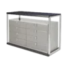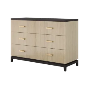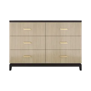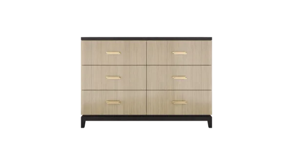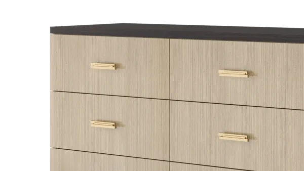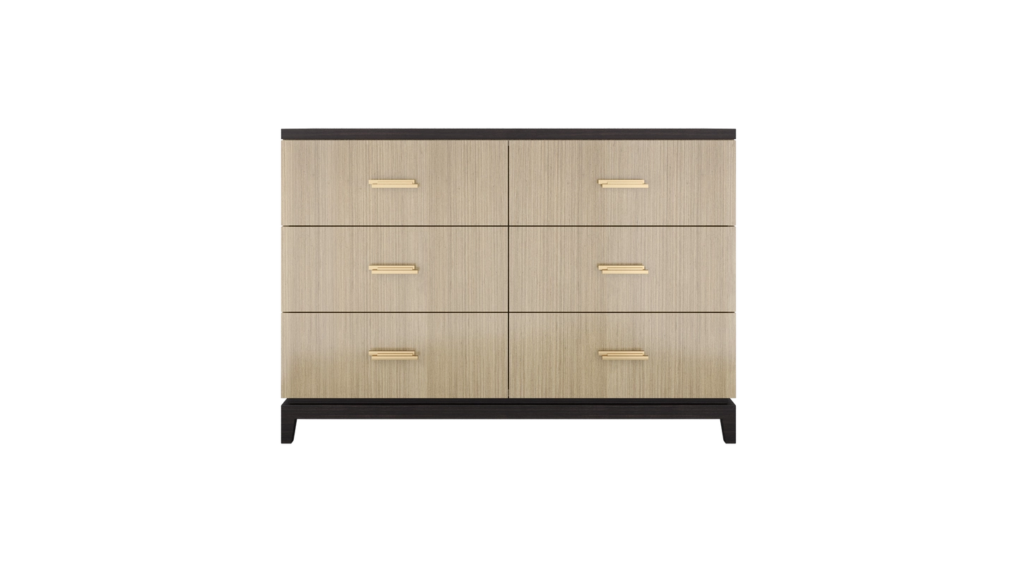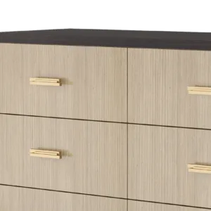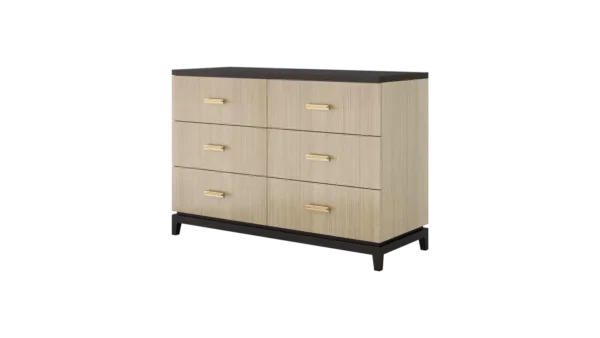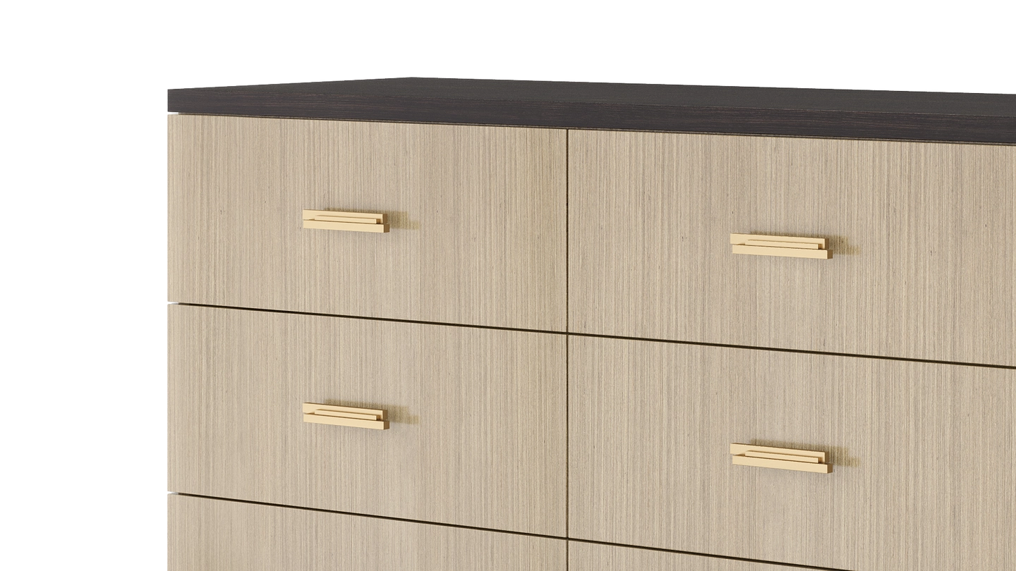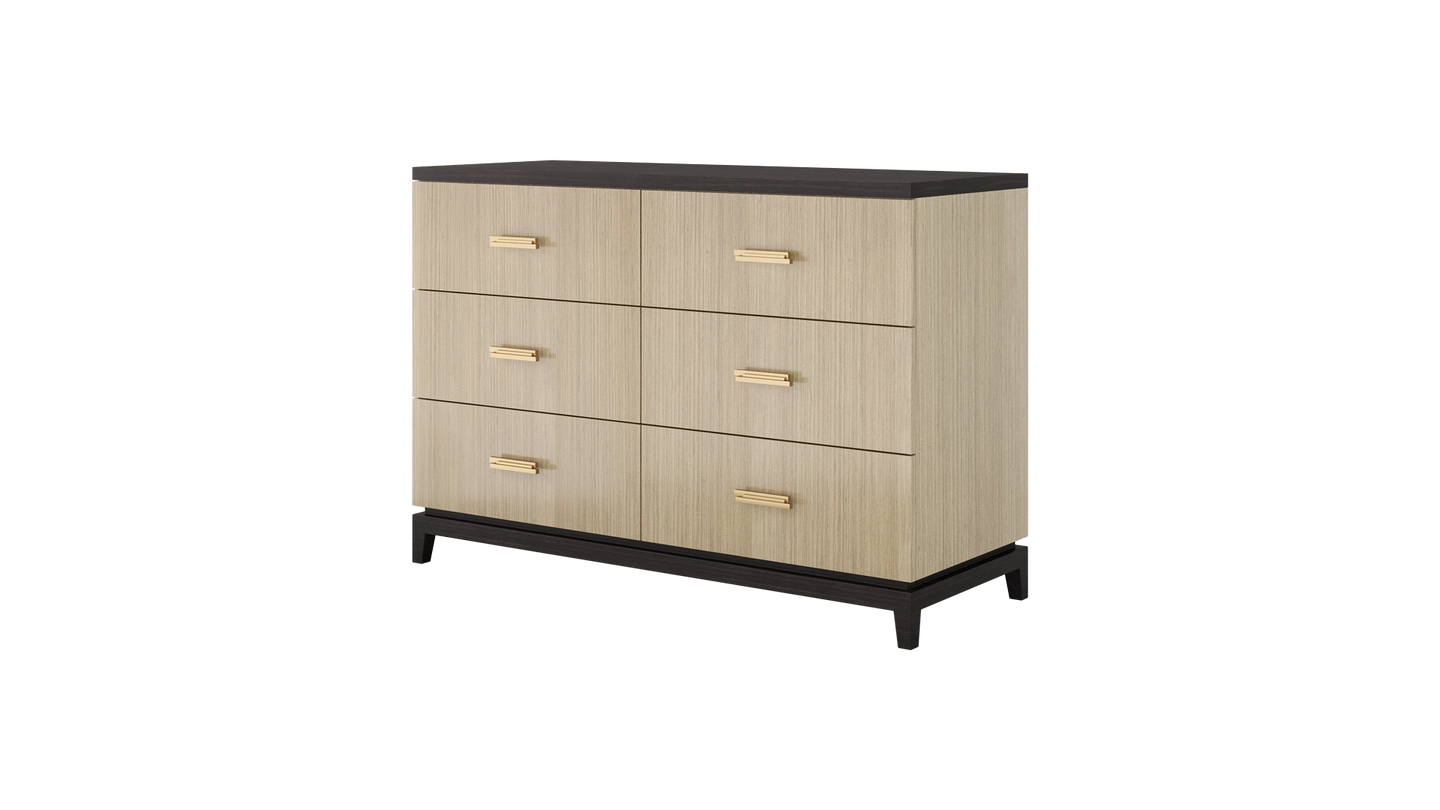 The chic LAGOA Chest of Drawers incorporates six generous drawers, each lined in soft suede and embellished with distinctive brushed-brass handles. Fashioned from wood veneer, a darker tone across the base and the surface adds contour to the design.