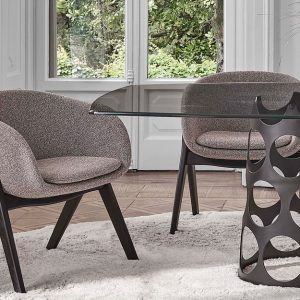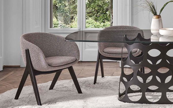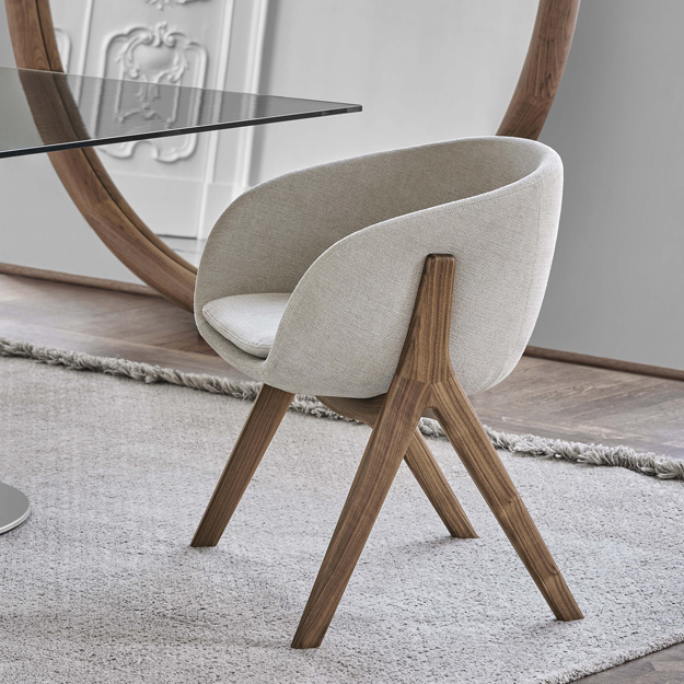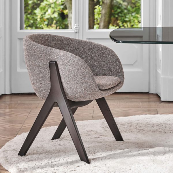 The Lambda chair by Porada is a playful design with a curved upholstered seat, back and armrests that cocoon the occupier. The seat is cradled by a solid wood frame with two legs on either side that meet to elegantly form one piece and support the rounded seat.