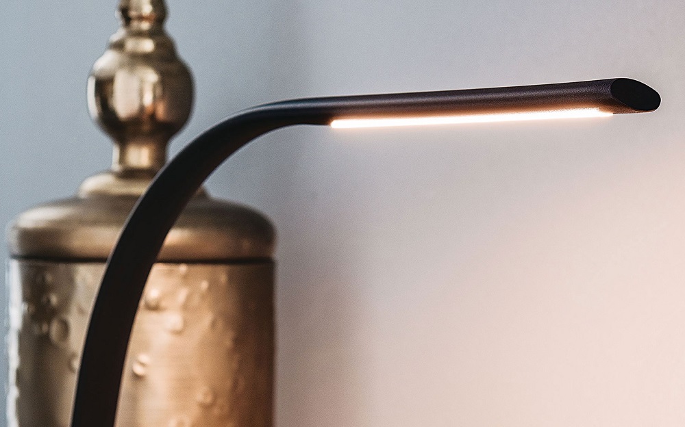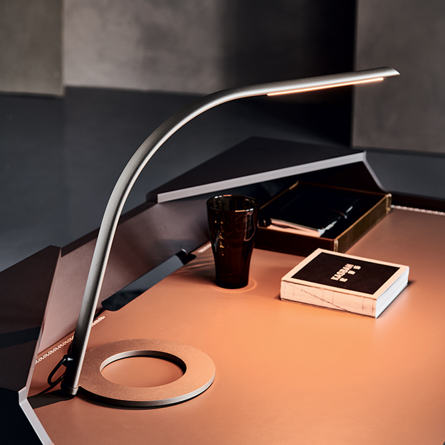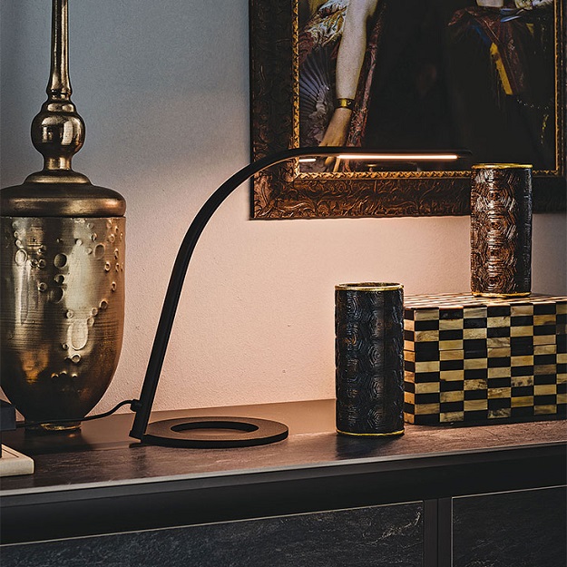 The stylish Lampo table lamp is a contemporary slim-line design featuring a weighted circular base. Its sleek frame is available in a selection of embossed lacquered steel finishes.