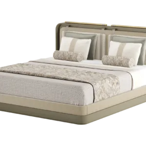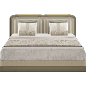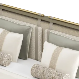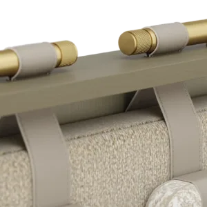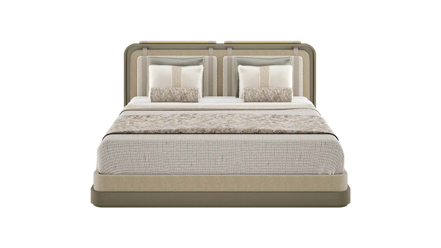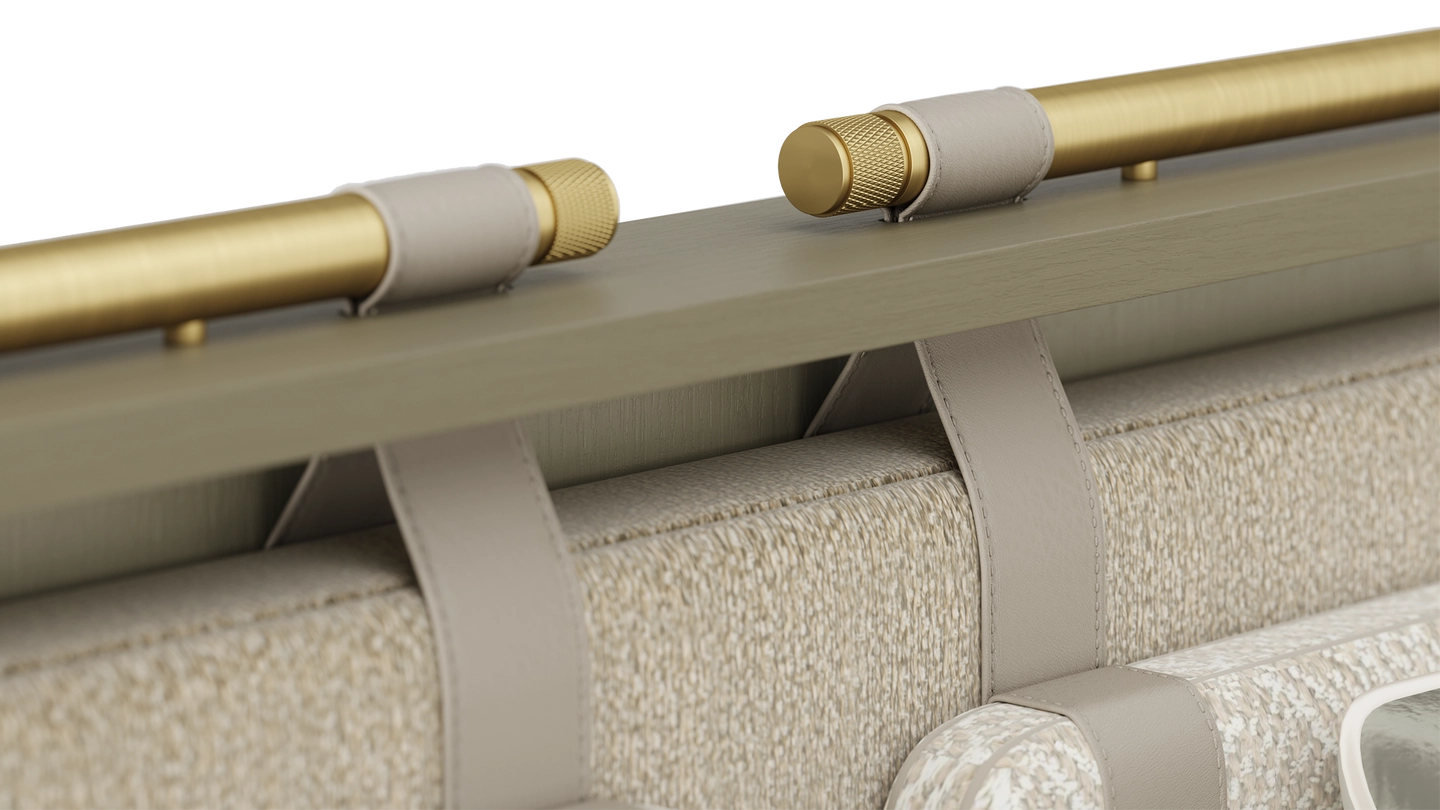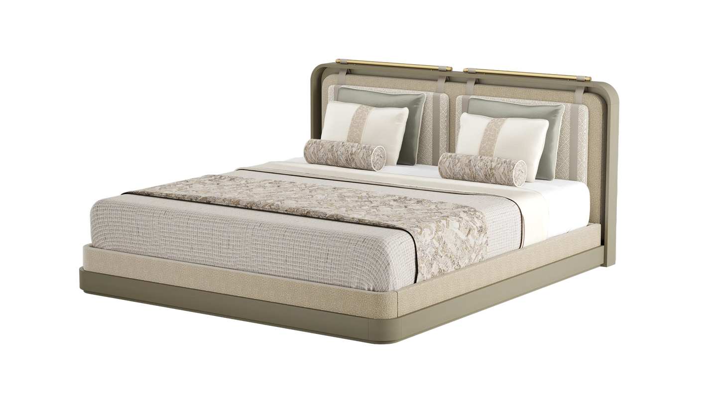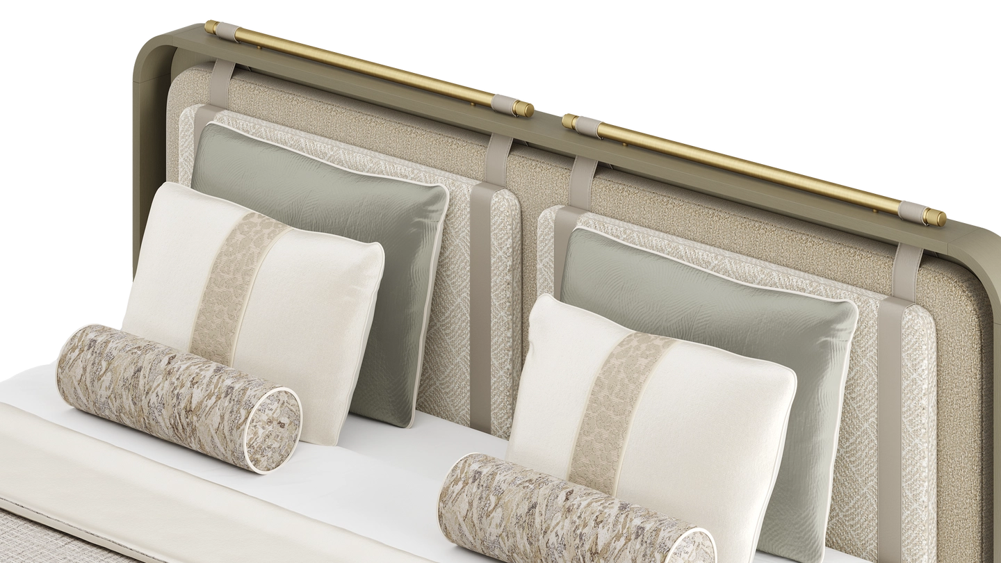 Let our LAMU Bed take centre stage in your bedroom. The commanding shape features a solid base and encompassing headboard, both finished in fabric. Leather and brushed brass details give it the perfect finish.