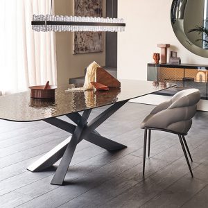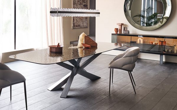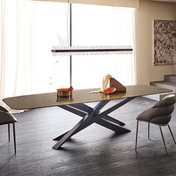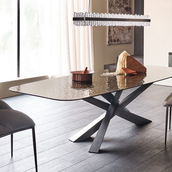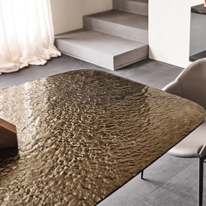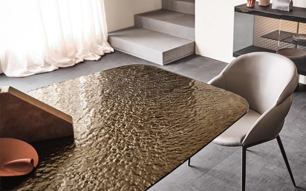The Lancer Moonglass table by Cattelan Italia features an elegant rounded rectangular bronze burnt glass table top. The burned glass features a textured, three-dimensional finish that is irregular to the touch and may feature imperfections, streaks, colour variations and irregularities of shape, adding to the individuality of the design.