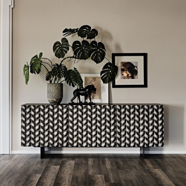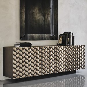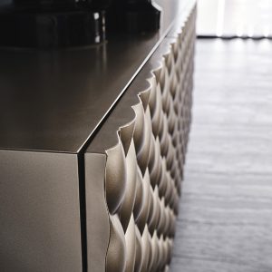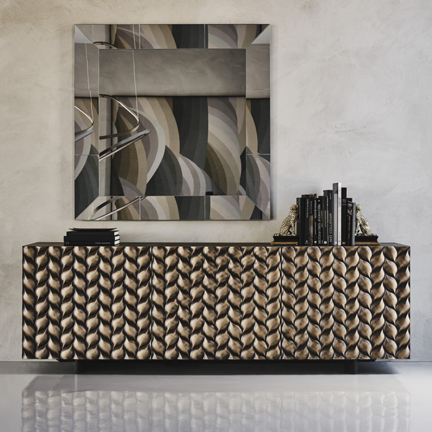 Stylish and contemporary, the Lavander Sideboard features doors in brushed bronze or brushed grey lacquered wood with an undulating lavender-inspired embossed pattern. Select from a choice of sizes and low and high styles, with internal glass shelves. A single matt graphite wood drawer inside each door section can be added as an optional extra.
