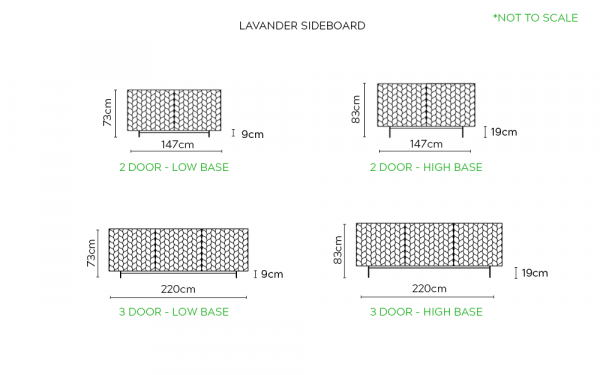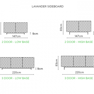 2 Door High – W: 147cm D: 46cm H: 83cm, 2 Door Low – W: 147cm D: 46cm H: 73cm, 3 Door High – W: 220cm D: 46cm H: 83cm, 3 Door Low – W: 220cm D: 46cm H: 73cm