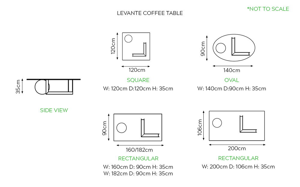 | Size | Oval – W: 140cm D: 90cm H: 35cm, Rectangular – W: 160cm D: 90cm H: 35cm, Rectangular – W: 182cm D: 90cm H: 35cm, Rectangular – W: 200cm D: 106cm H: 35cm, Square – W: 120cm D: 120cm H: 35cm |