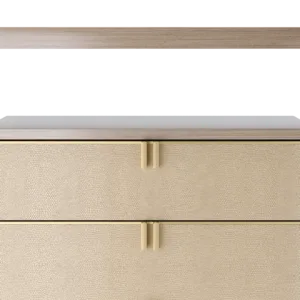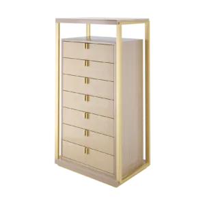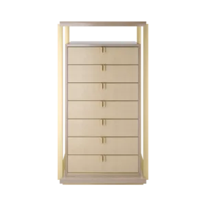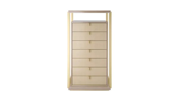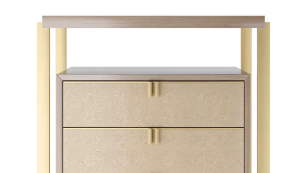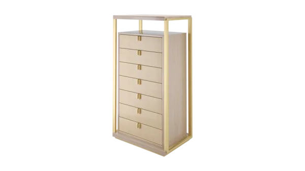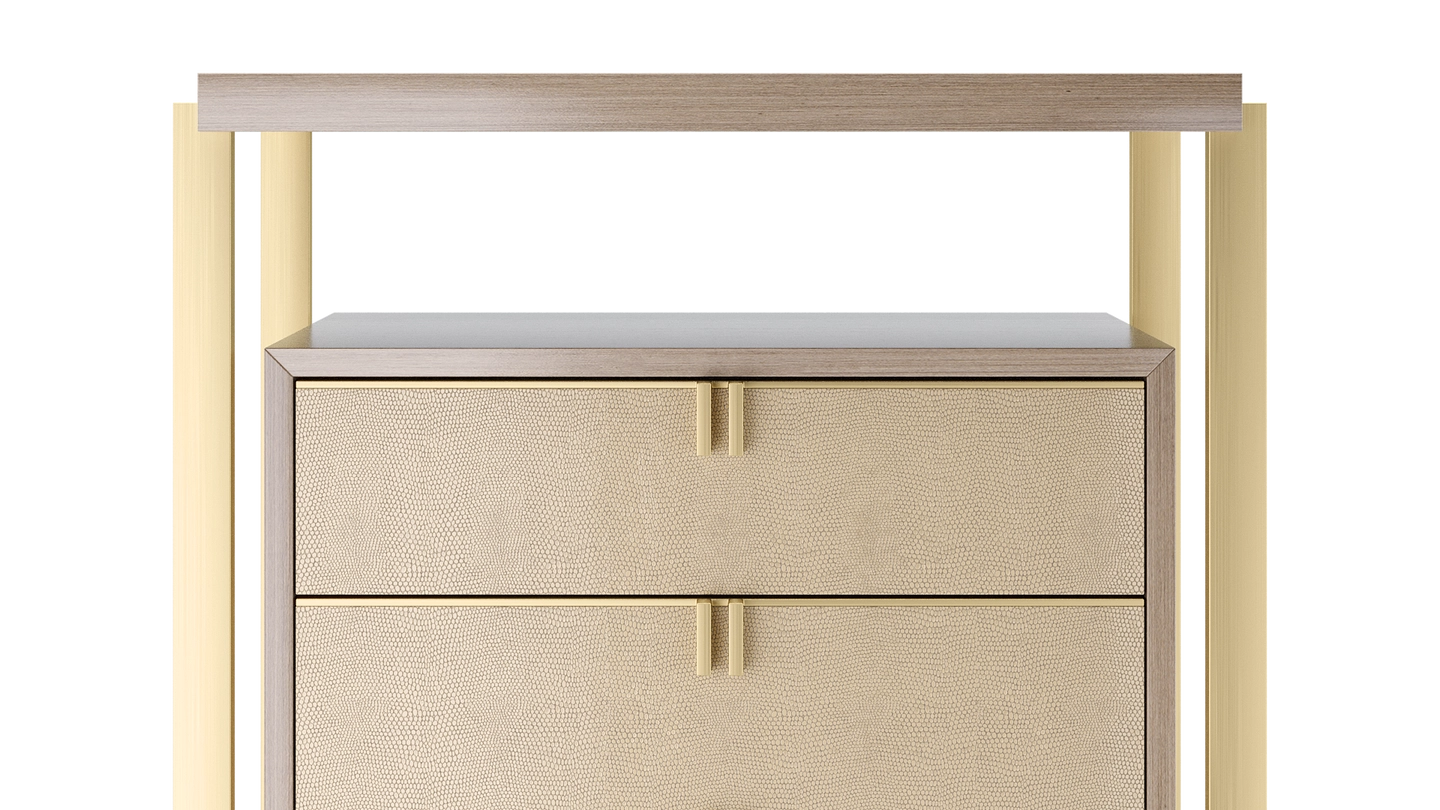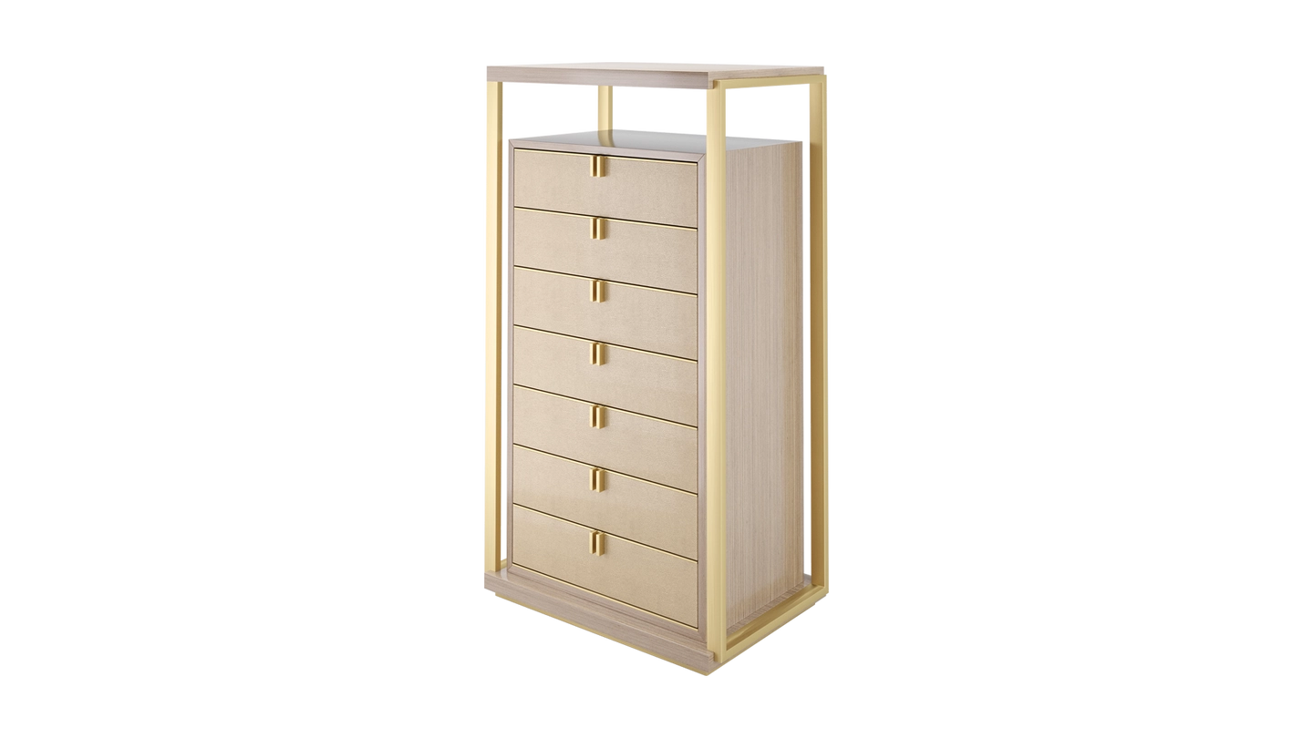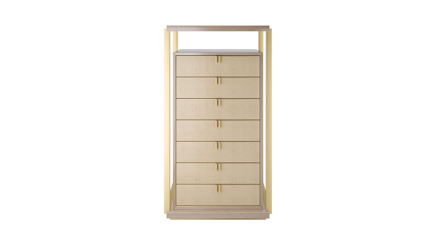 Playing with the idea of a design within a design, the LEXTON tallboy features a box of glossy wood veneer with seven drawers featuring brass handles, leather fronts and suede interiors. Around this, an interlocking structure of veneer and metal adds additional surface space and instant wow factor.
