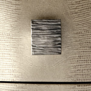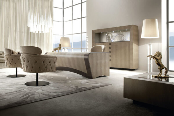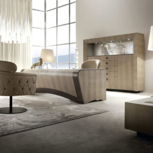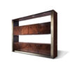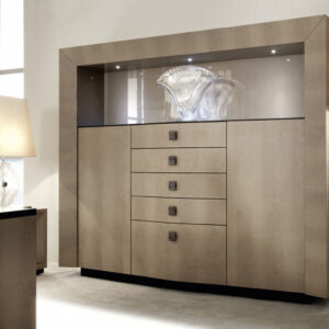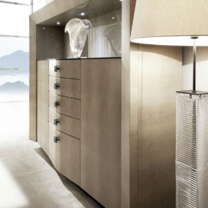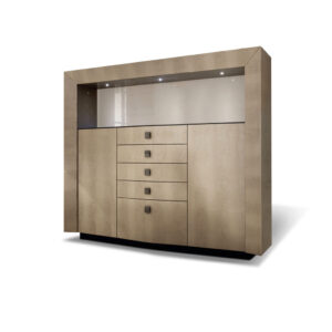 Double bookcase in armadillo printed leather with combination of bronzed brass top, base and handles. Back panel in high gloss polyester lacquer. 4 full extension drawers + 1 full extension file drawer with bottom in armadillo printed leather. Special led light sytem with 3 lights including touching switch.
